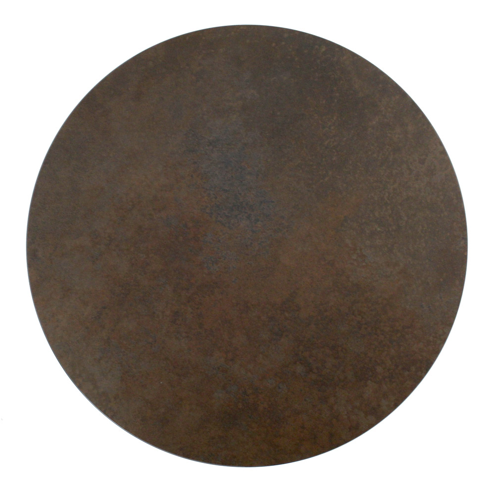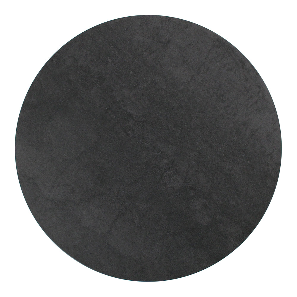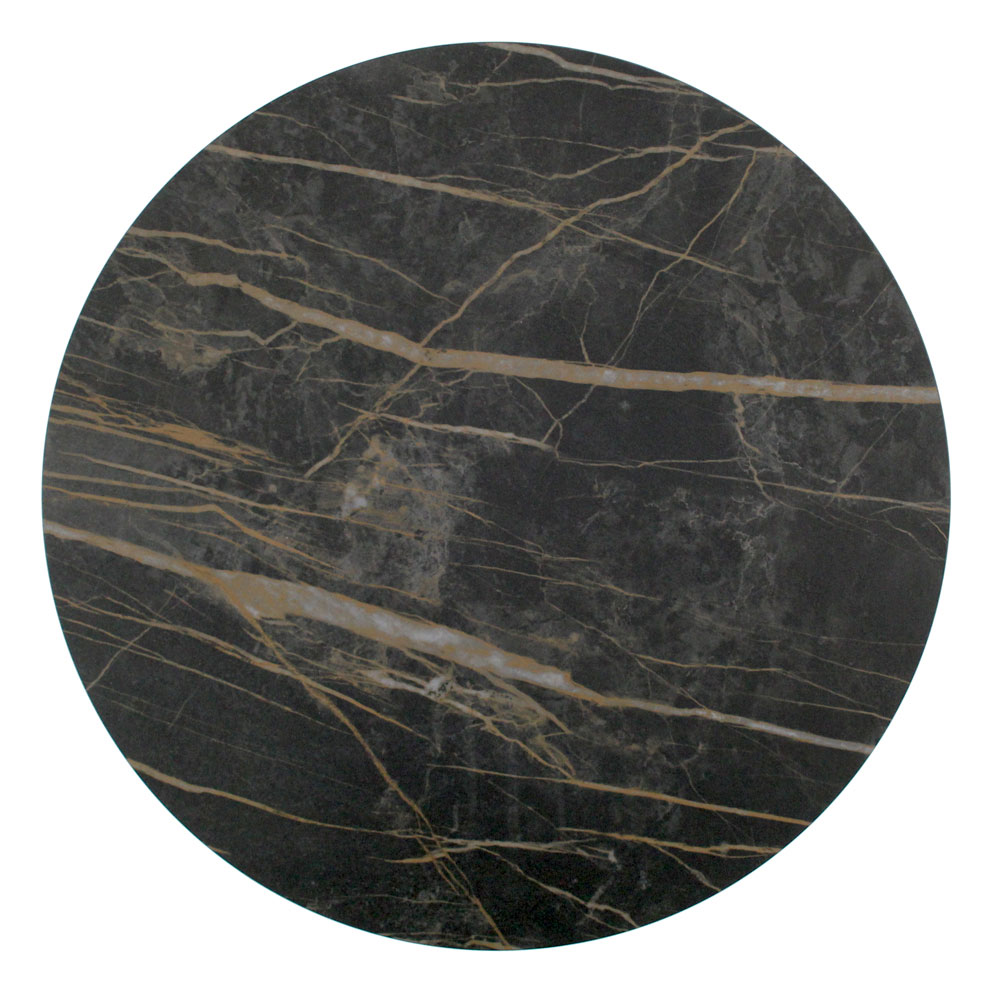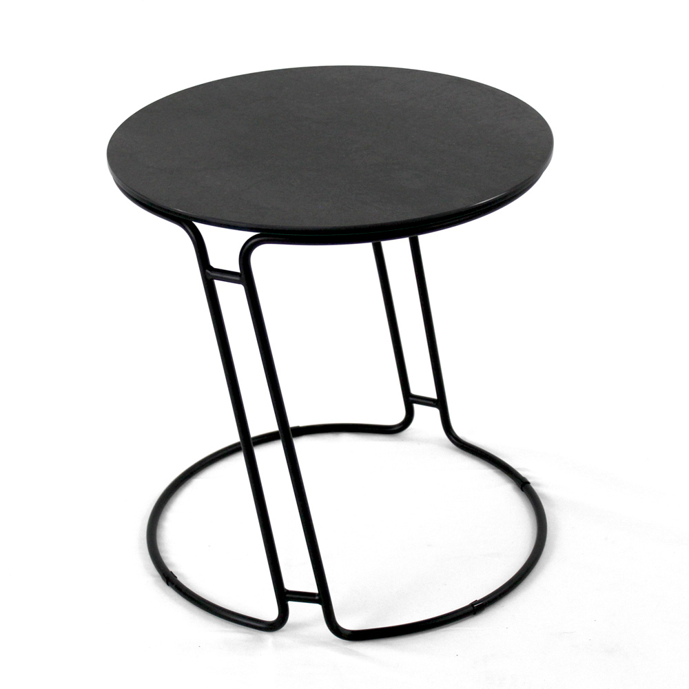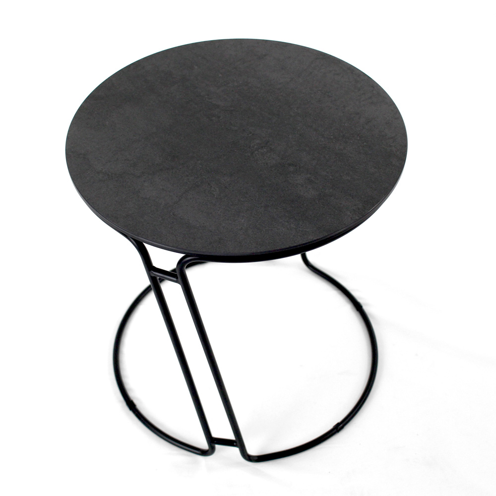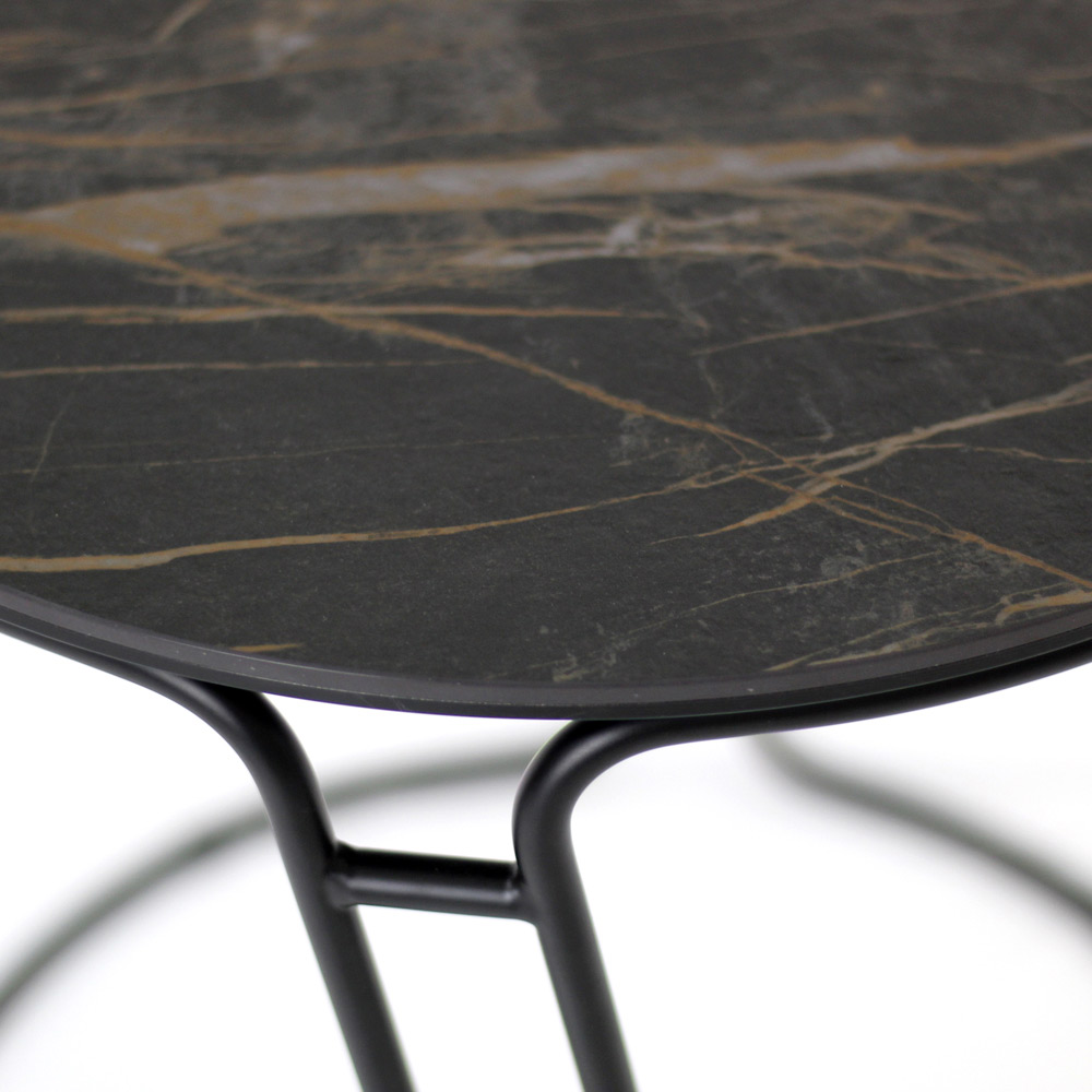 Mesita redonda con base de acero pintado y encimera de gres porcelánico.