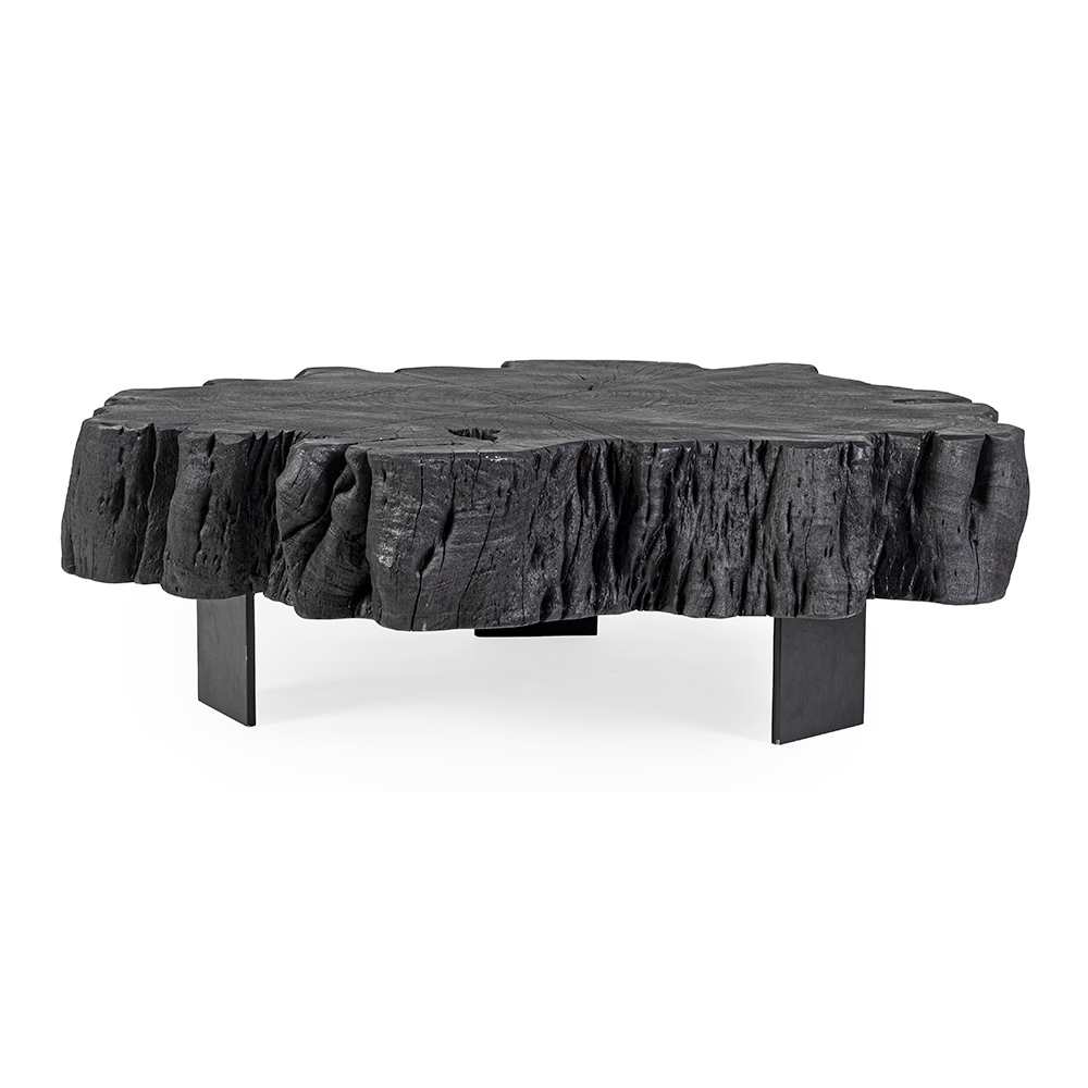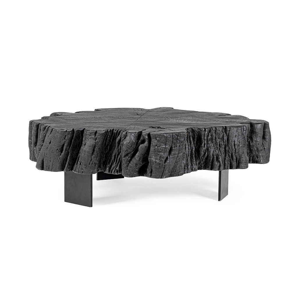 Mesa baja para el salón en acero y baúl de madera de acacia negra.