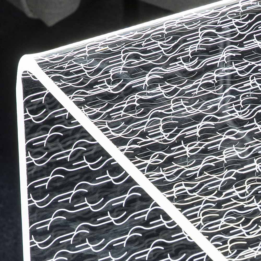 Esta lámpara de sobremesa led es mucho más que una simple luminaria: fabricada íntegramente en cristal acrílico plegado disponible en 2 variantes de texturas grabadas con láser que realzan los matices cromáticos, los grabados originales se iluminan en todas las paredes gracias a una ' tira de led única colocada en el centro.