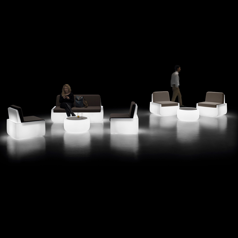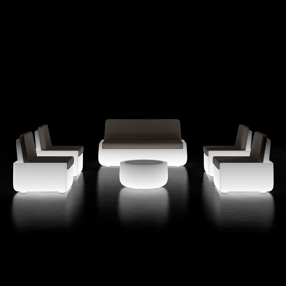 Mesita de exterior de diseño bajo en polietileno con tapa en HPL y luz LED Made in Italy.