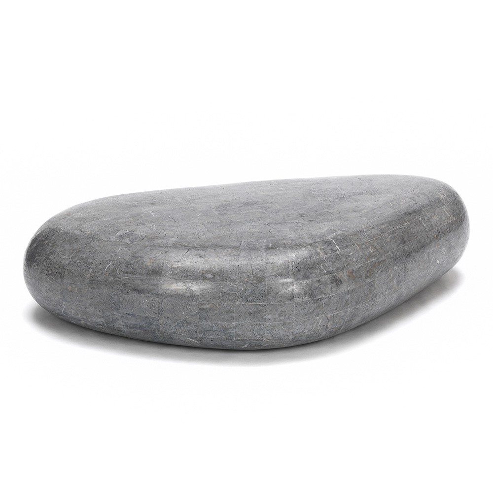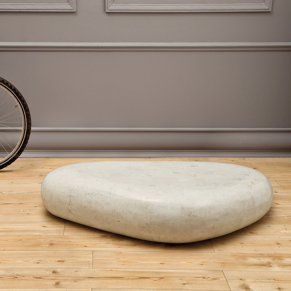 Esta mesa de centro diseñada para el salón tiene un diseño sencillo y esencial. Constituido por un bloque de piedra fósil de forma triangular.