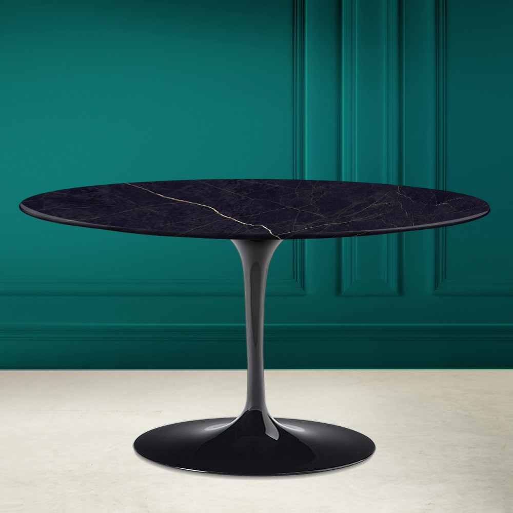 Mesa de centro ovalada con tapa de cerámica noir laurent y base de aluminio pulido Made in Italy