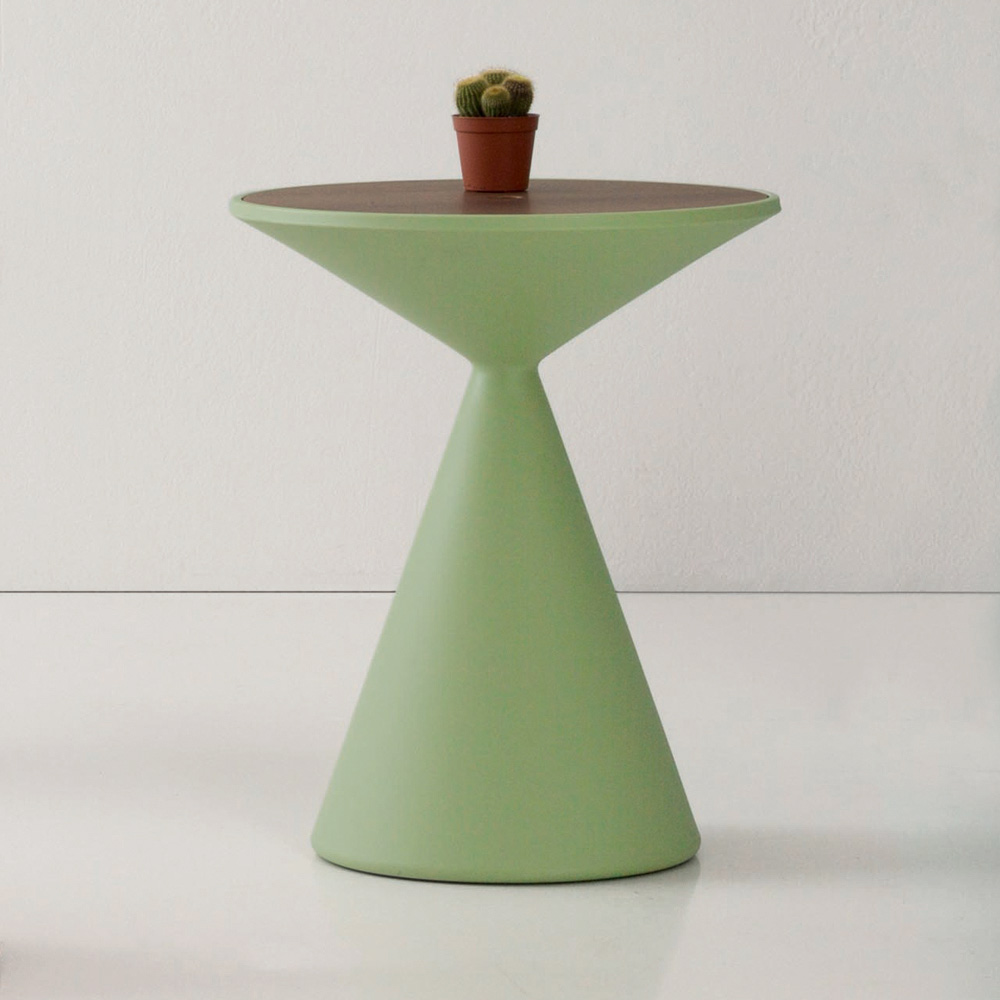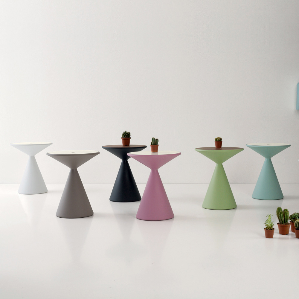 Mesa de exterior redonda en polietileno de color con contenedor interno fabricada en Italia.