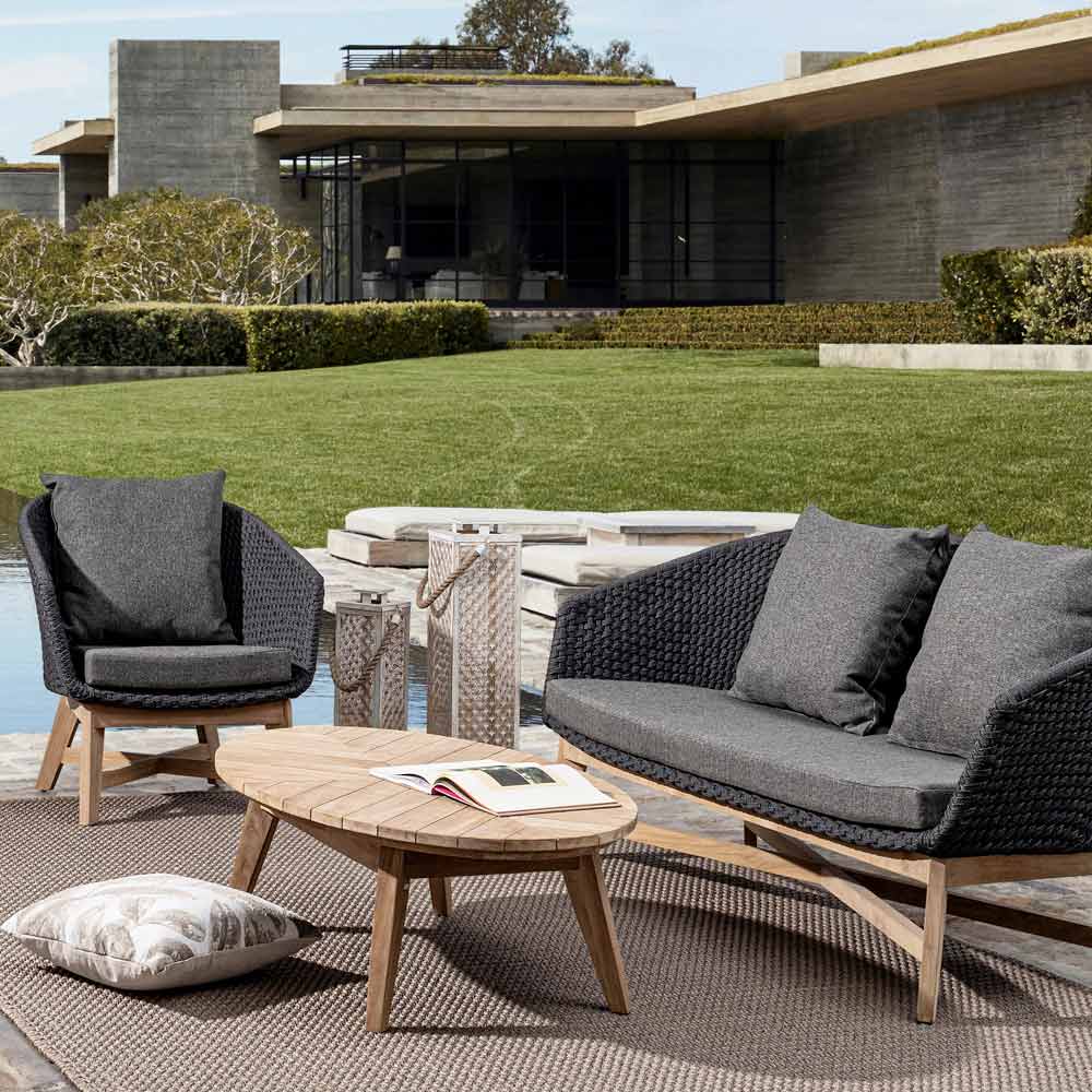 Mesa de centro para exterior en madera de teca con tapa ovalada.