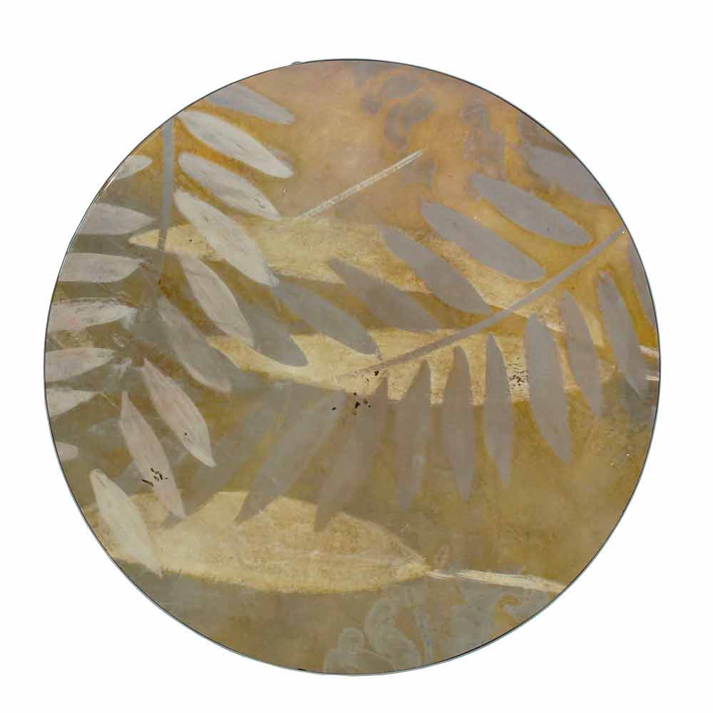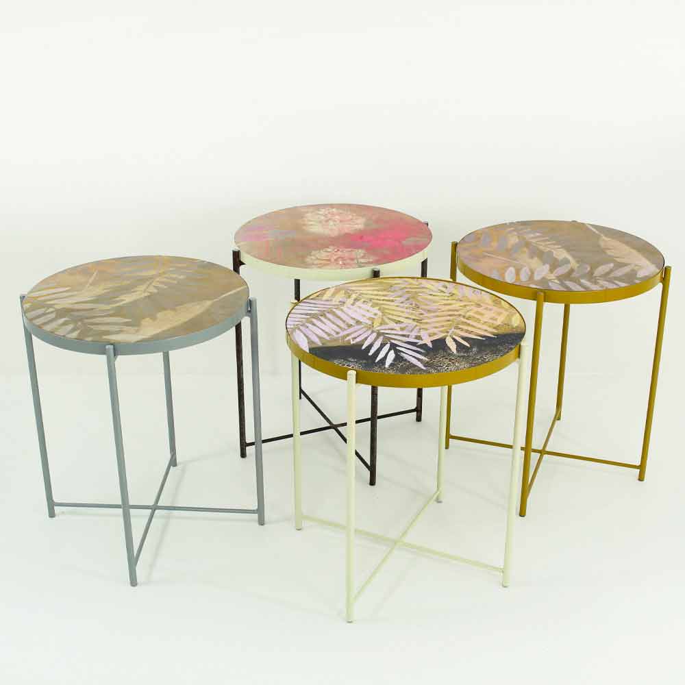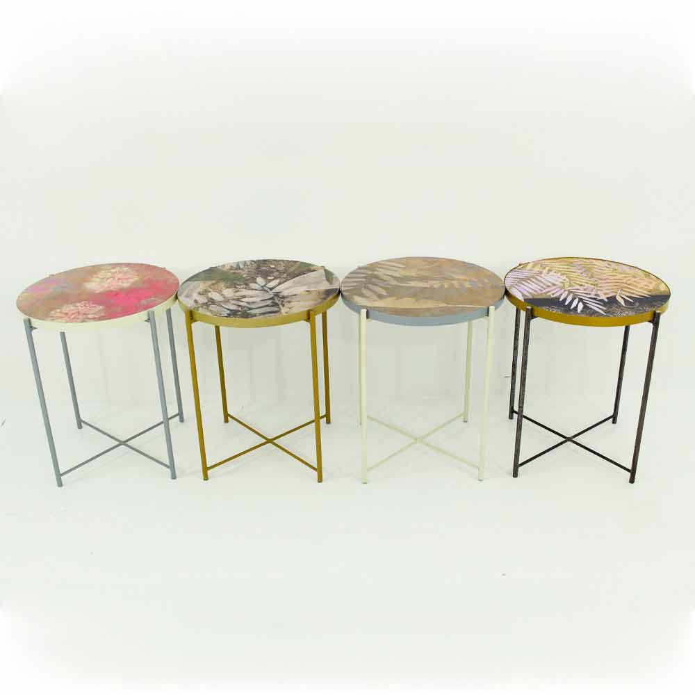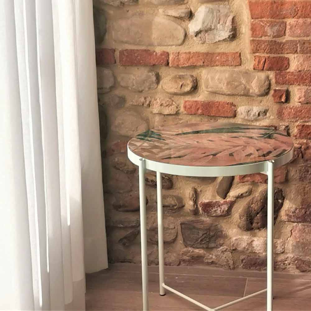 Mesa de centro para interior o exterior con base y tablero de metal decorado y revestido de resina Made in Italy.