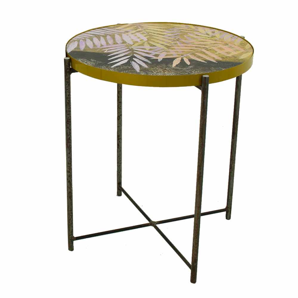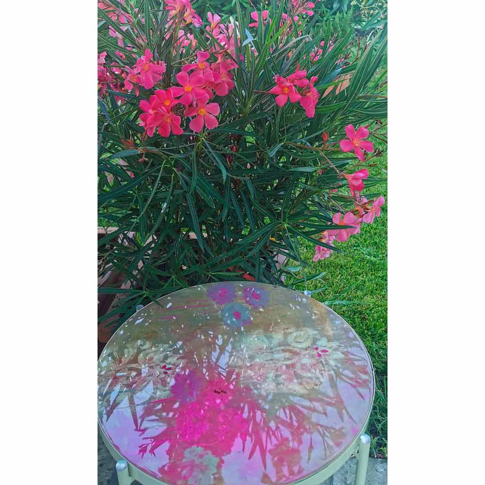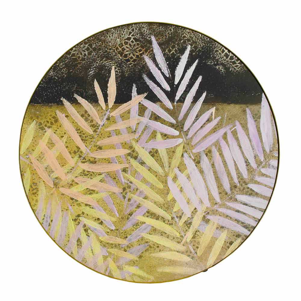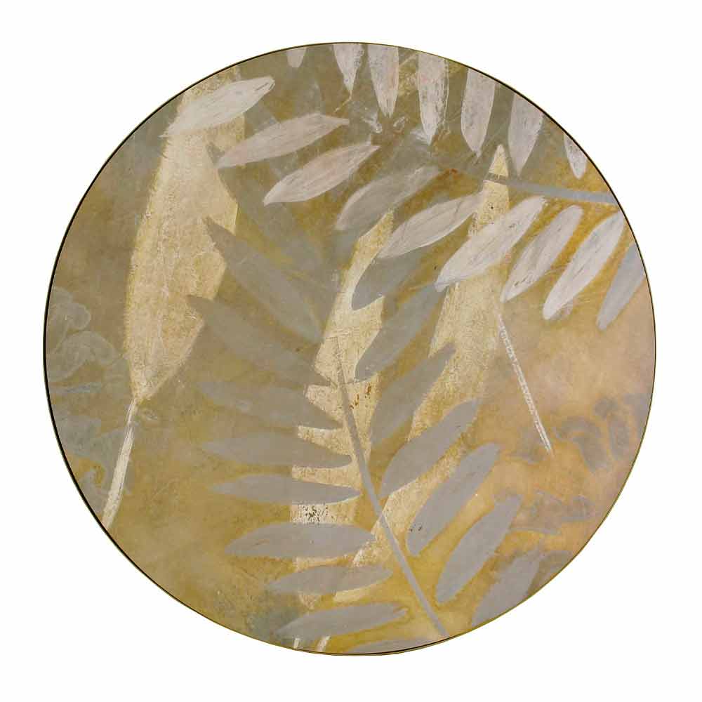 Mesa de centro para interior o exterior con base y tablero de metal decorado y revestido de resina Made in Italy.