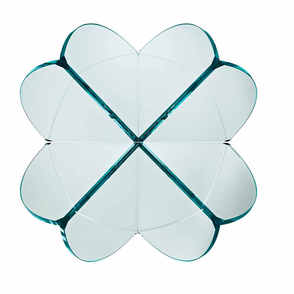 La creación en vidrio soldado , utilizando láminas de vidrio muy gruesas, es el resultado de un proceso único que requiere una precisión extrema y que permite obtener estructuras muy resistentes, especialmente en las juntas, que quedan completamente transparentes gracias a colas especiales.