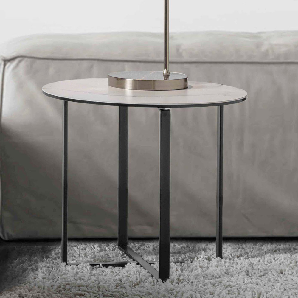 Mesa de centro moderna con tapa redonda realizada en cristal cerámico acabado mármol blanco y base de metal pintado de negro. Su diseño se puede describir como simple y esencial , perfecto para completar discretamente cualquier sala de estar con muebles modernos. Lo que aumenta su encanto son los materiales y acabados elegidos, que consiguen dar vida a un mueble particularmente elegante y sobrio capaz de enriquecer el aspecto de la estancia actuando como una práctica superficie de apoyo para bebidas, libros, revistas o cualquier otro objeto. quieres tener a mano y al mismo tiempo como un elemento decorativo refinado.