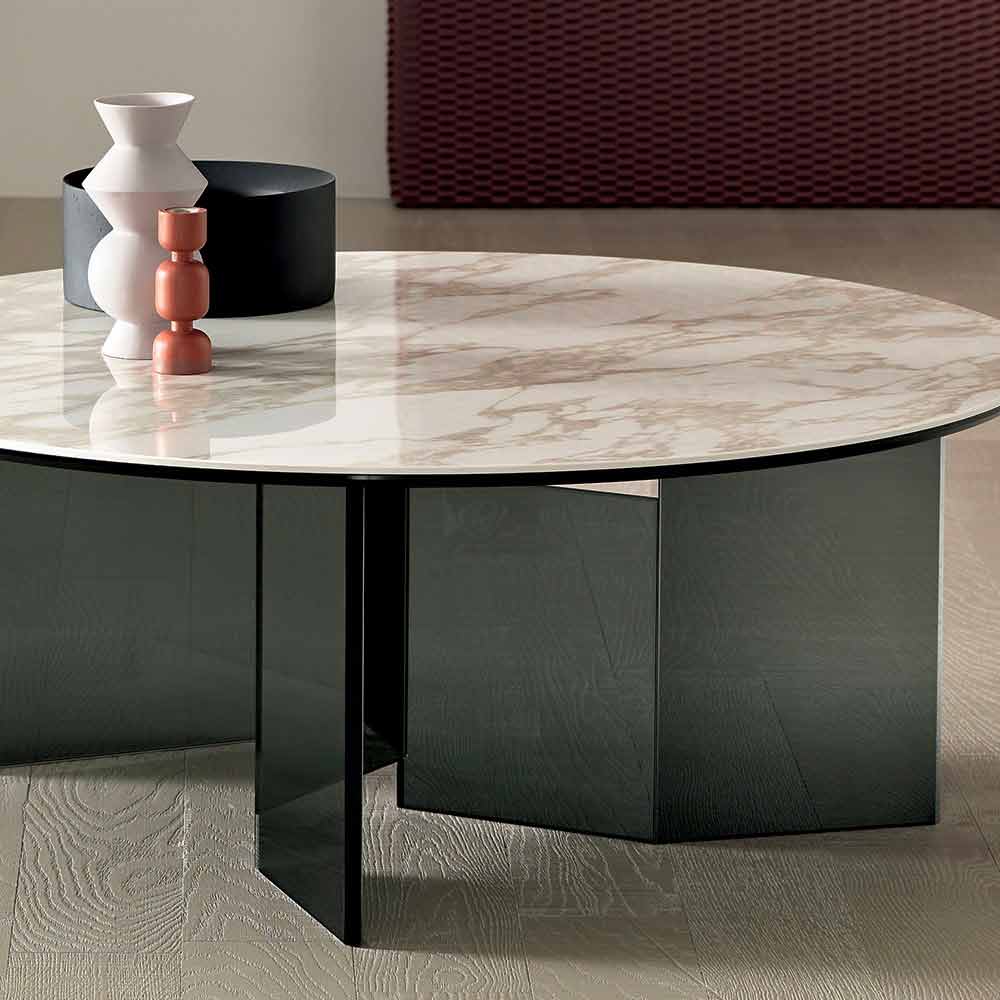Esta mesa de centro redonda se caracteriza por la particular ejecución de la base.