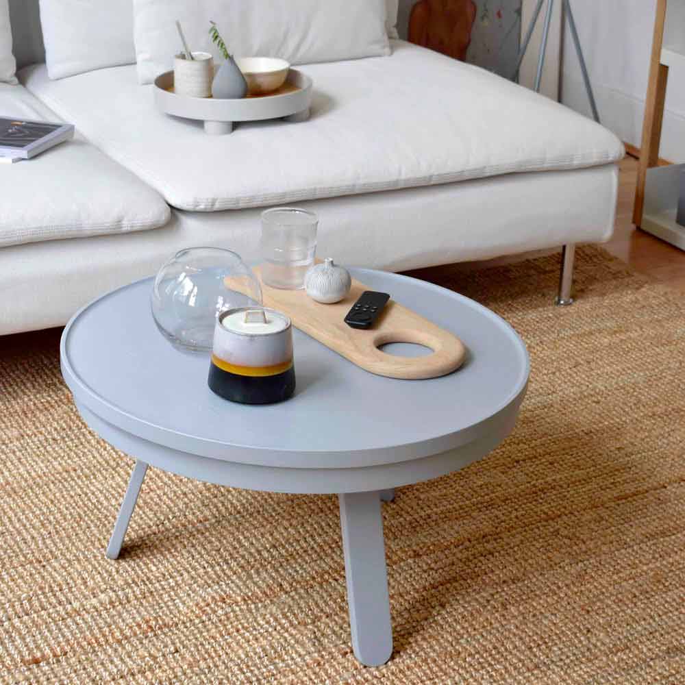 Mesa de centro redonda de madera maciza y acero con compartimento de almacenamiento.