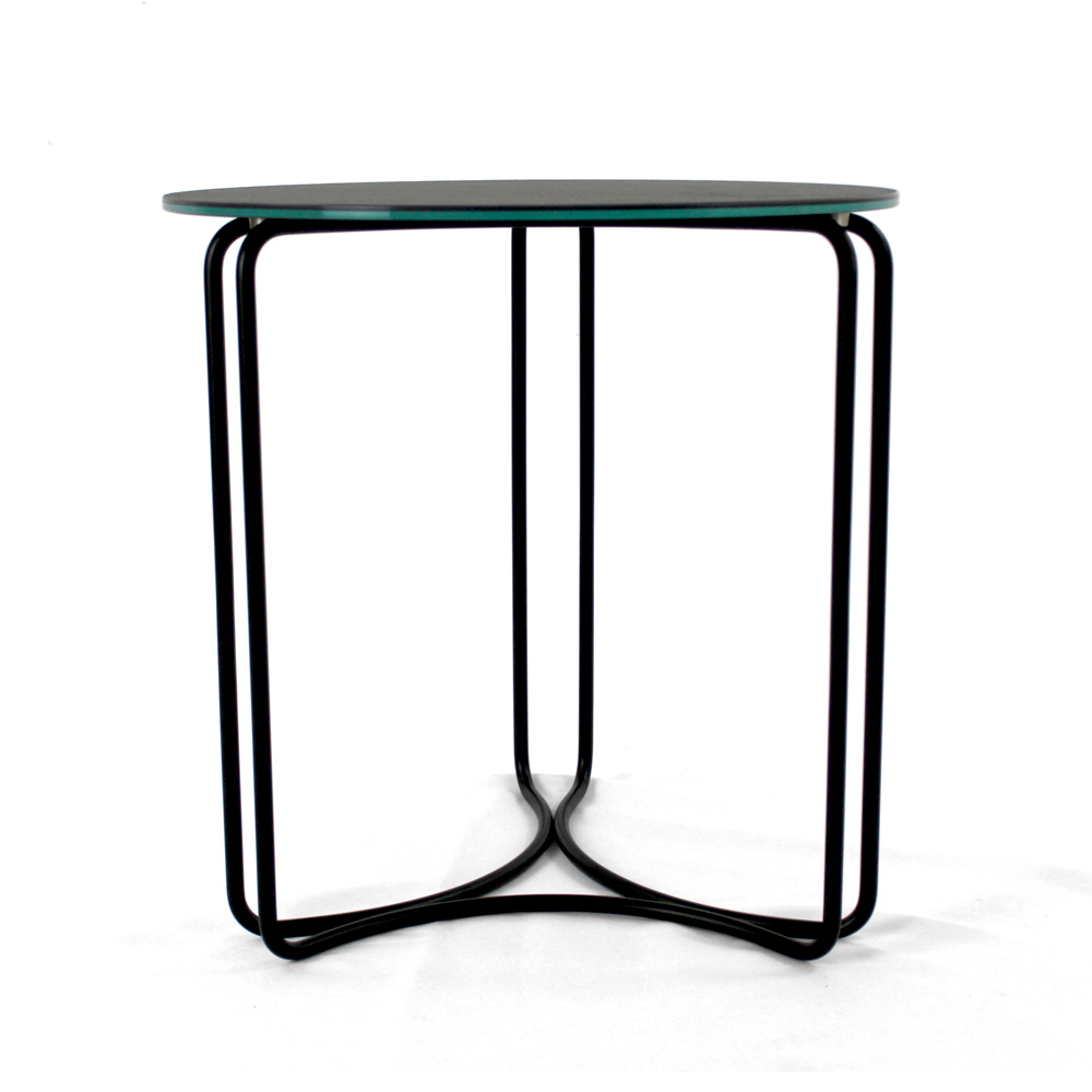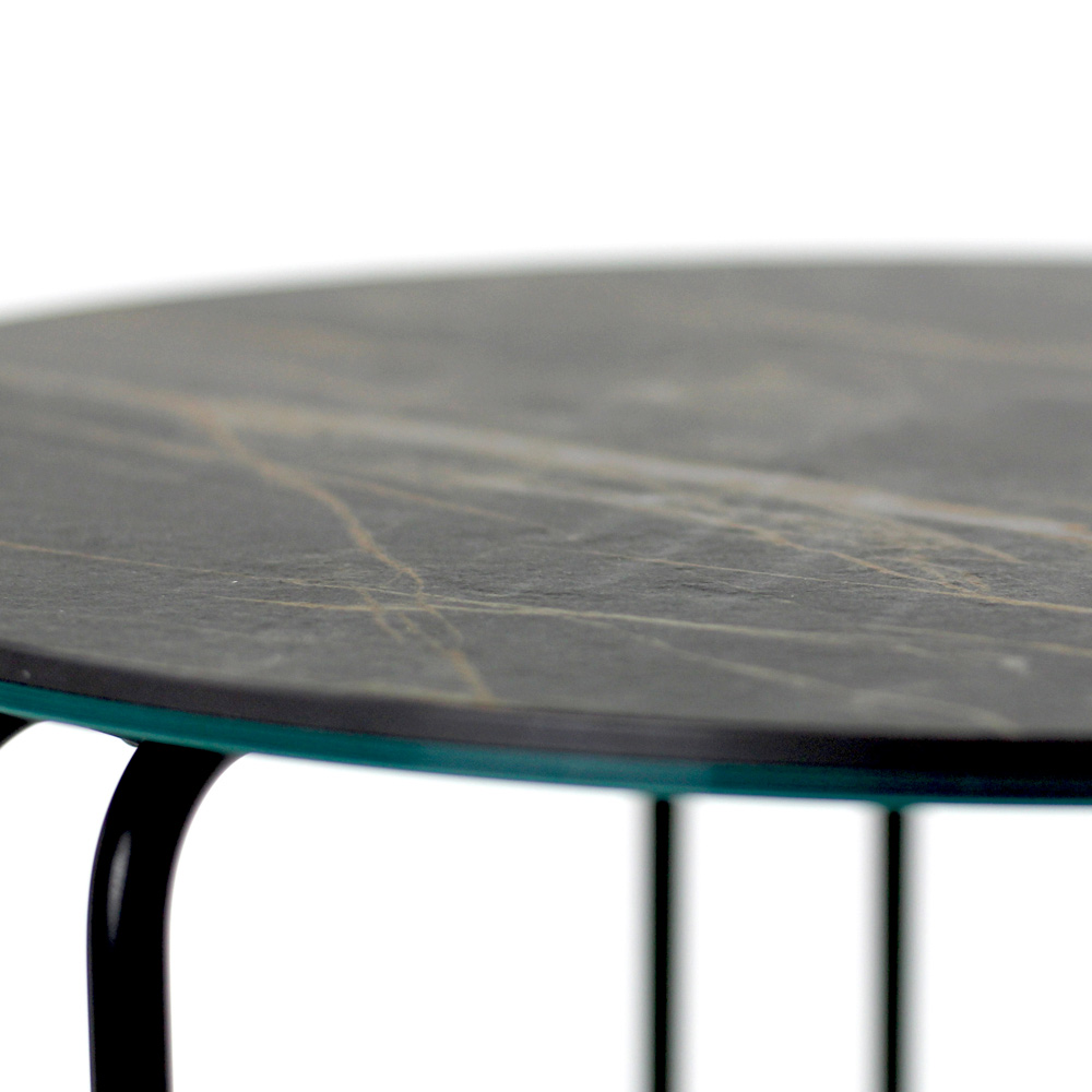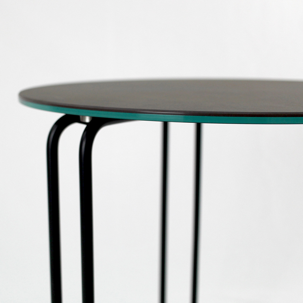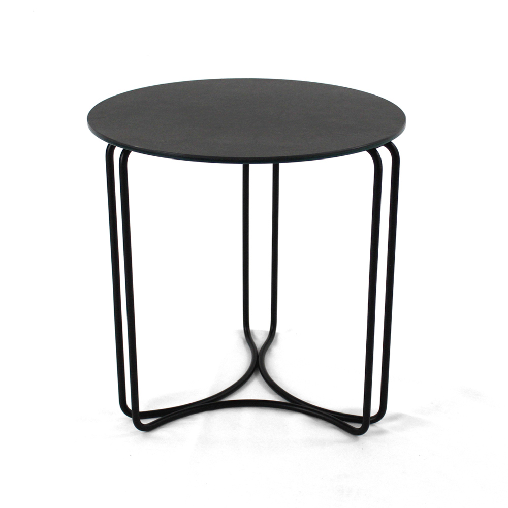 Mesita redonda con base de acero pintado y encimera de gres porcelánico.