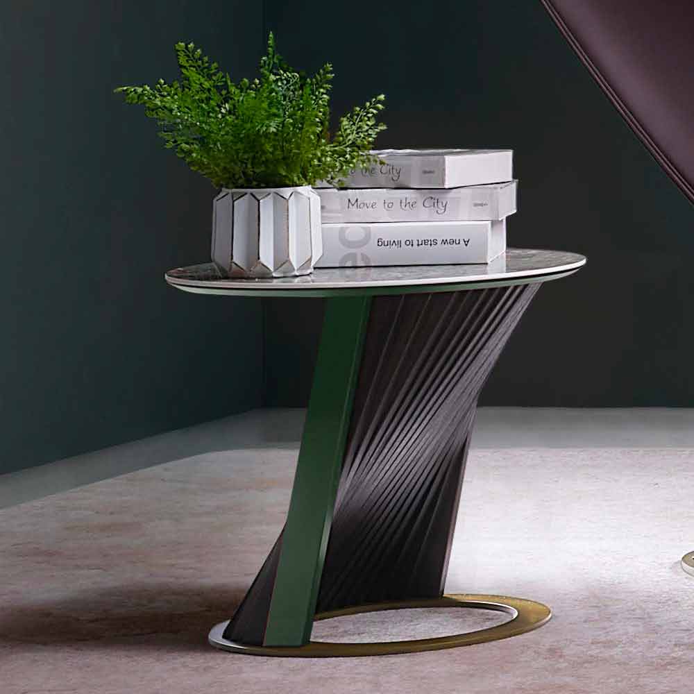 Mesa de centro de diseño con tapa redonda en gres efecto mármol, artículo de lujo Made in Italy.