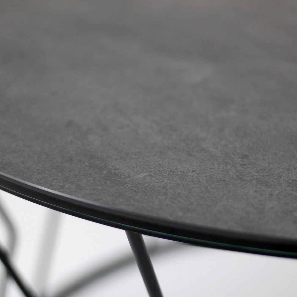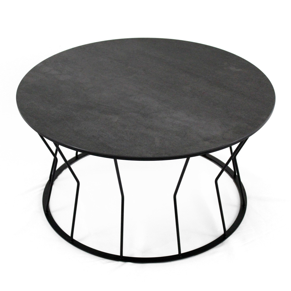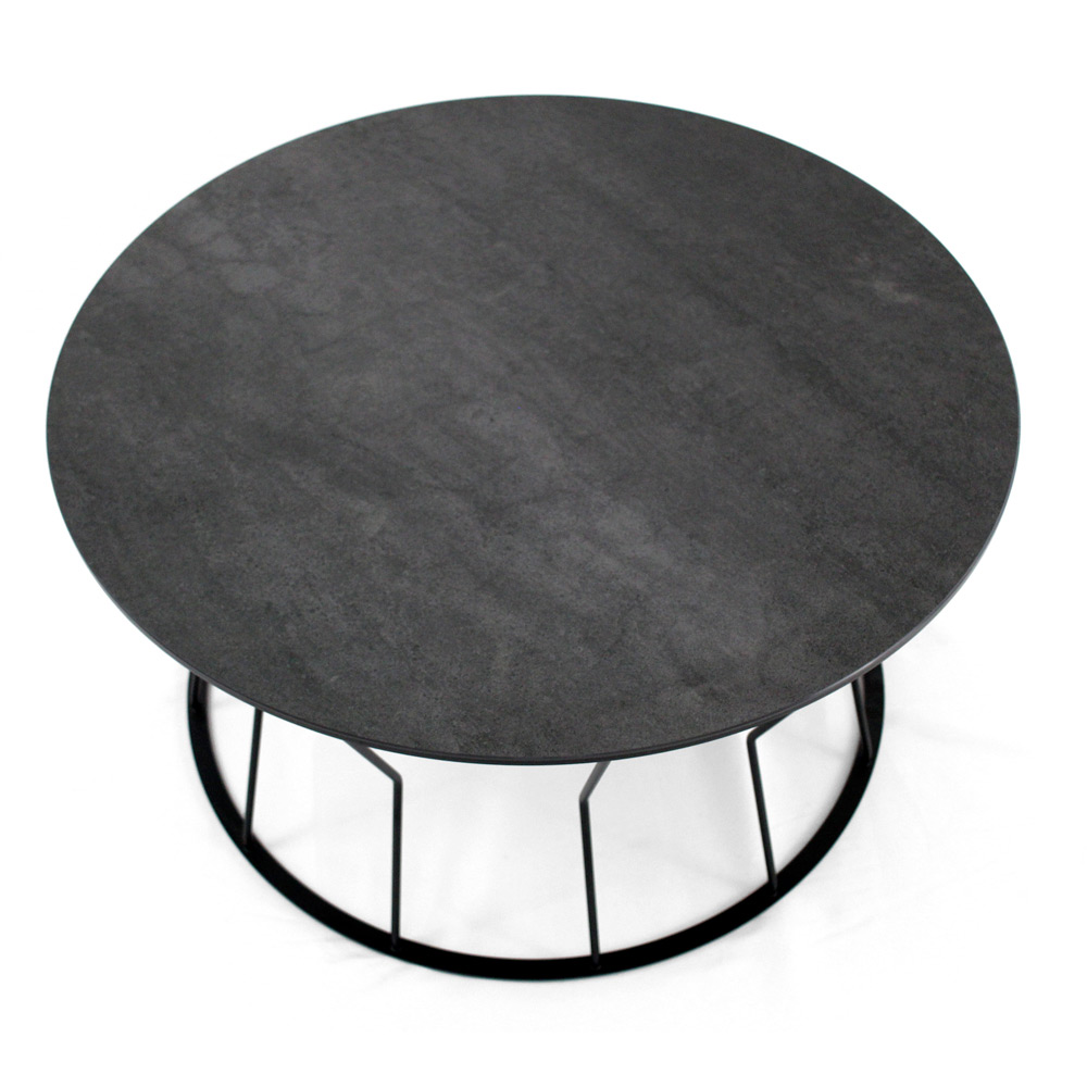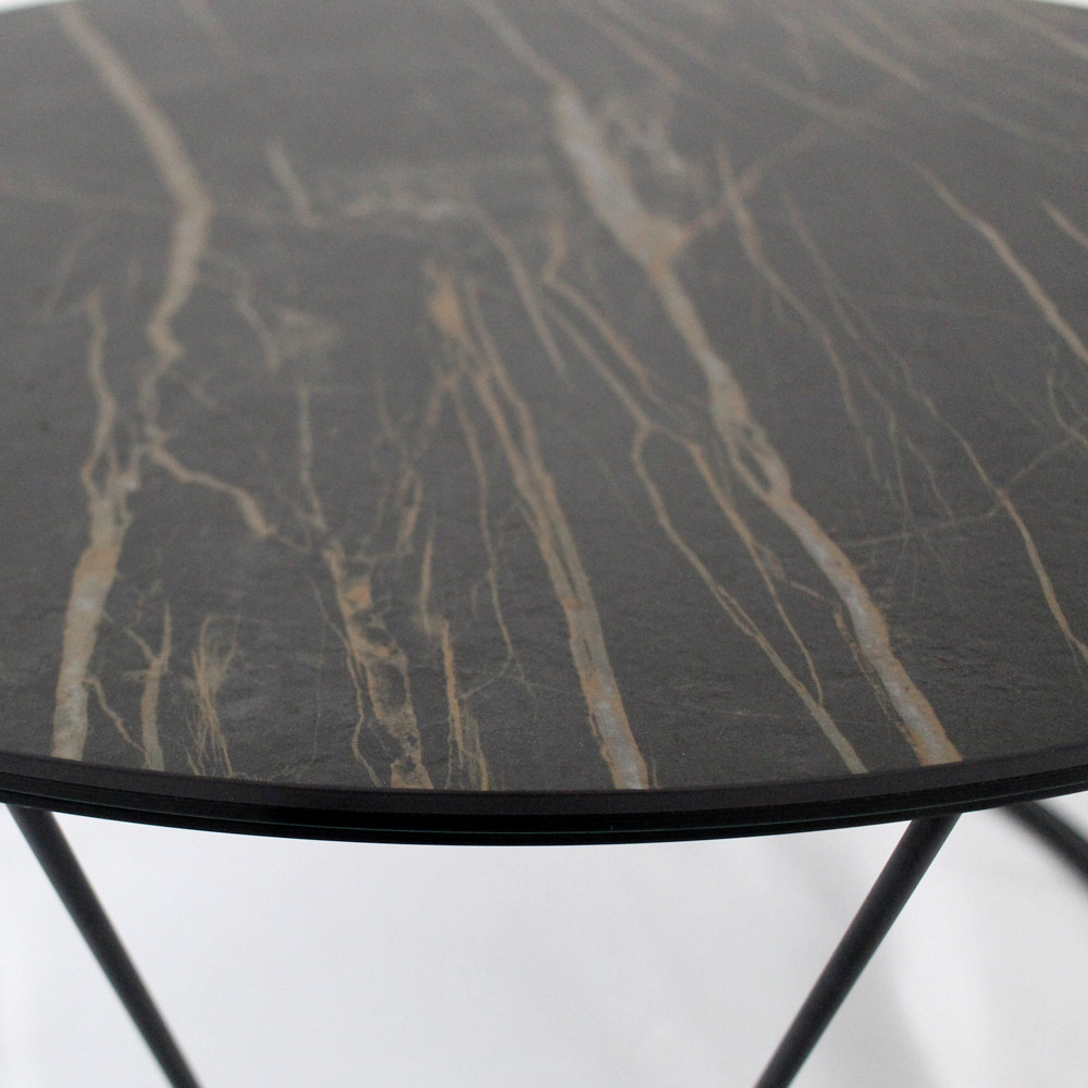 Mesita redonda con base de acero pintado y encimera de gres porcelánico.