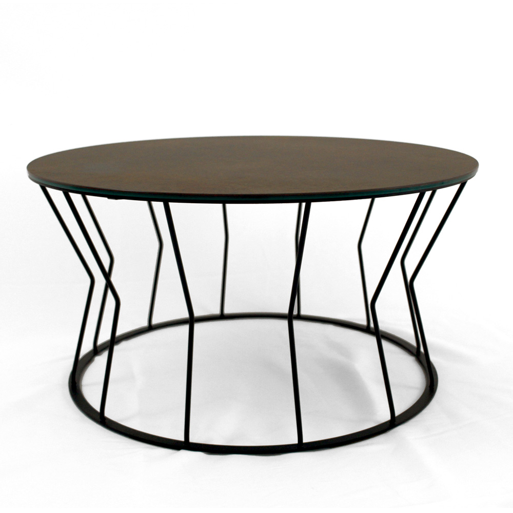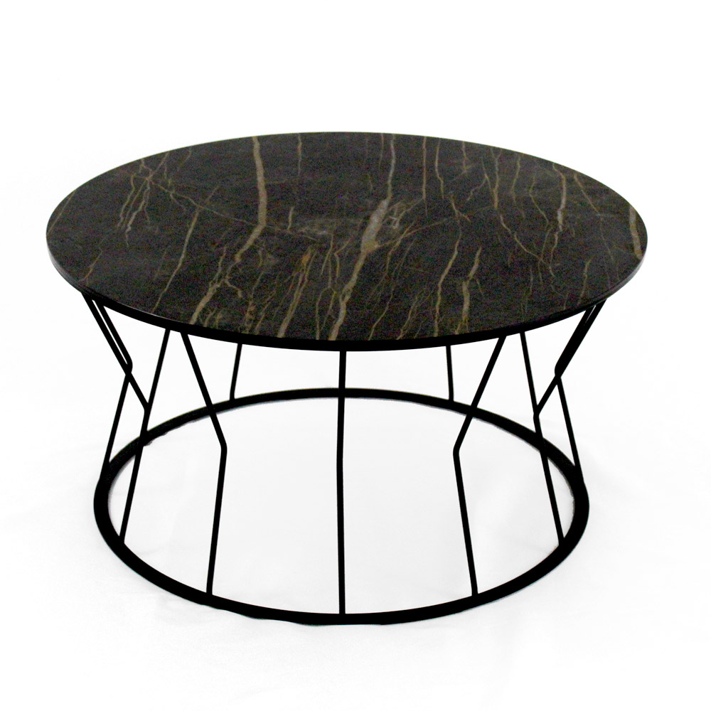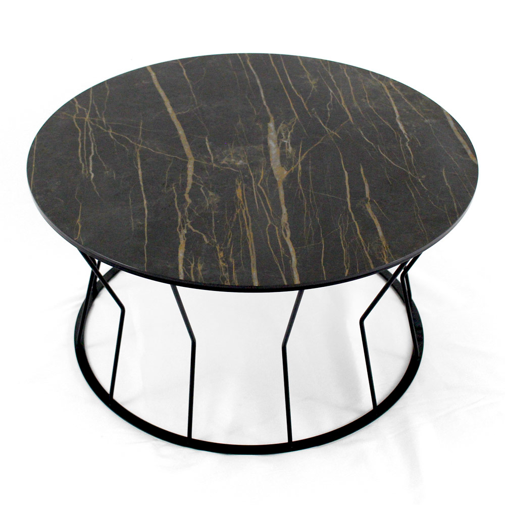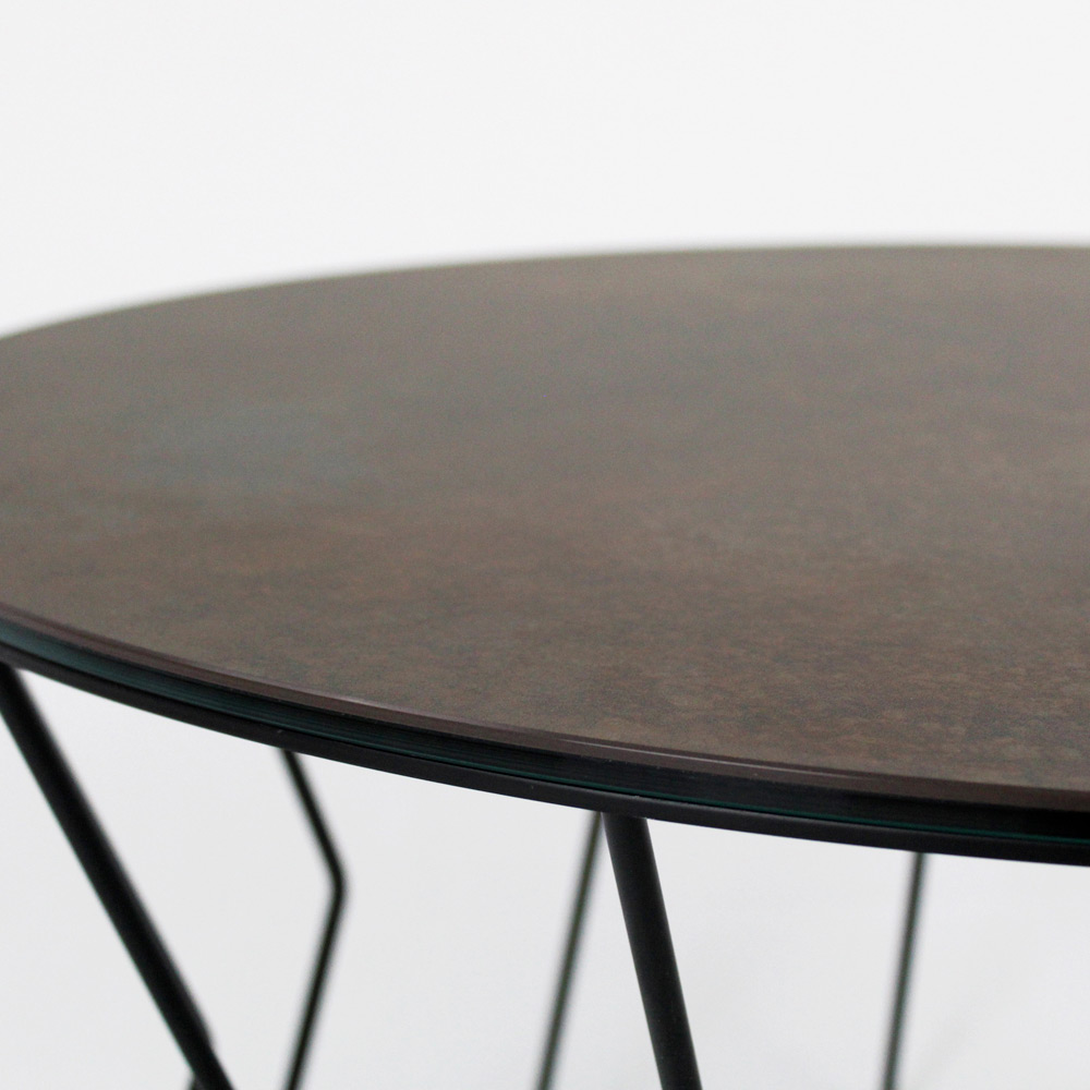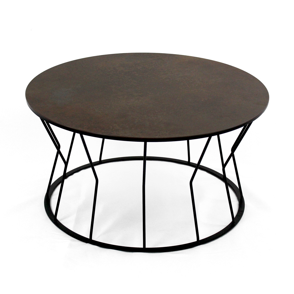 Mesita redonda con base de acero pintado y encimera de gres porcelánico.