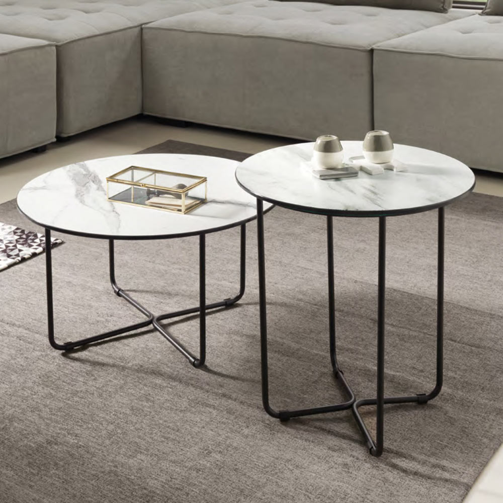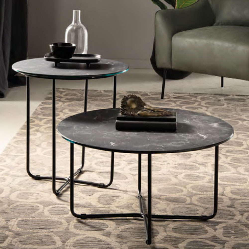 Mesita con tapa redonda de cristal efecto mármol Made in Italy.