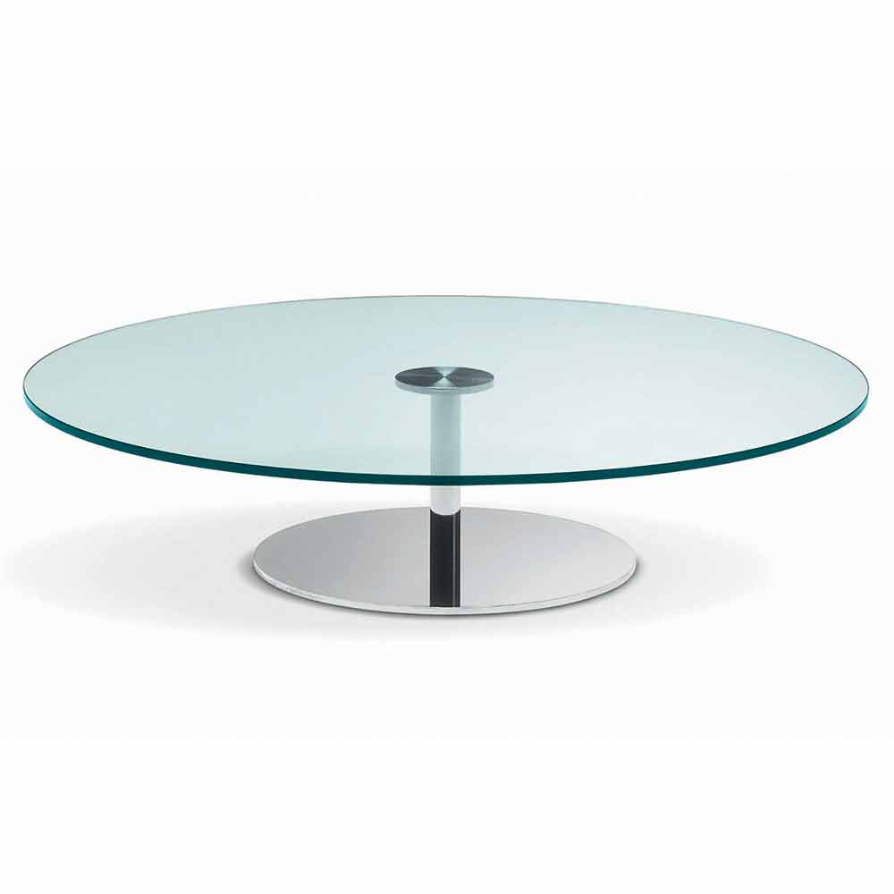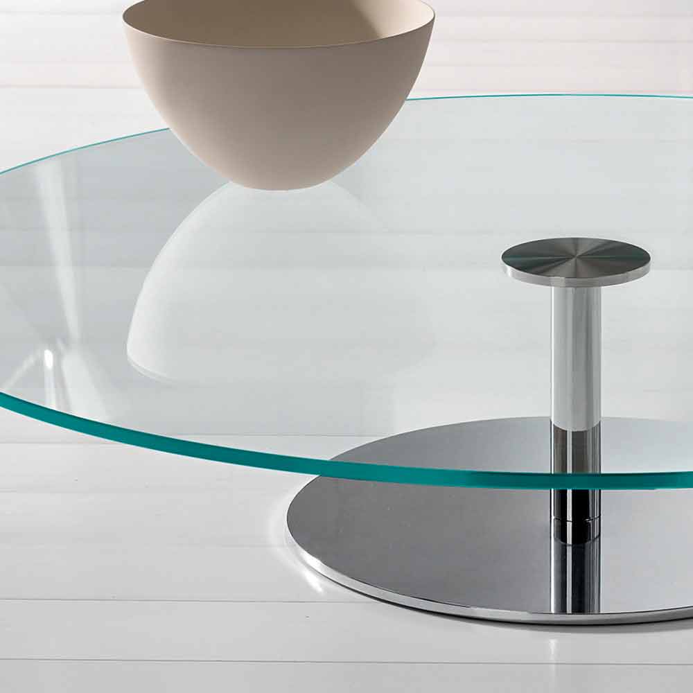 Esta mesita baja para salón de diseño redondo se caracteriza por la tapa realizada íntegramente en cristal extraclaro y una base de soporte de metal en acabado cromado, que crea maravillosos efectos luminosos y tridimensionales.