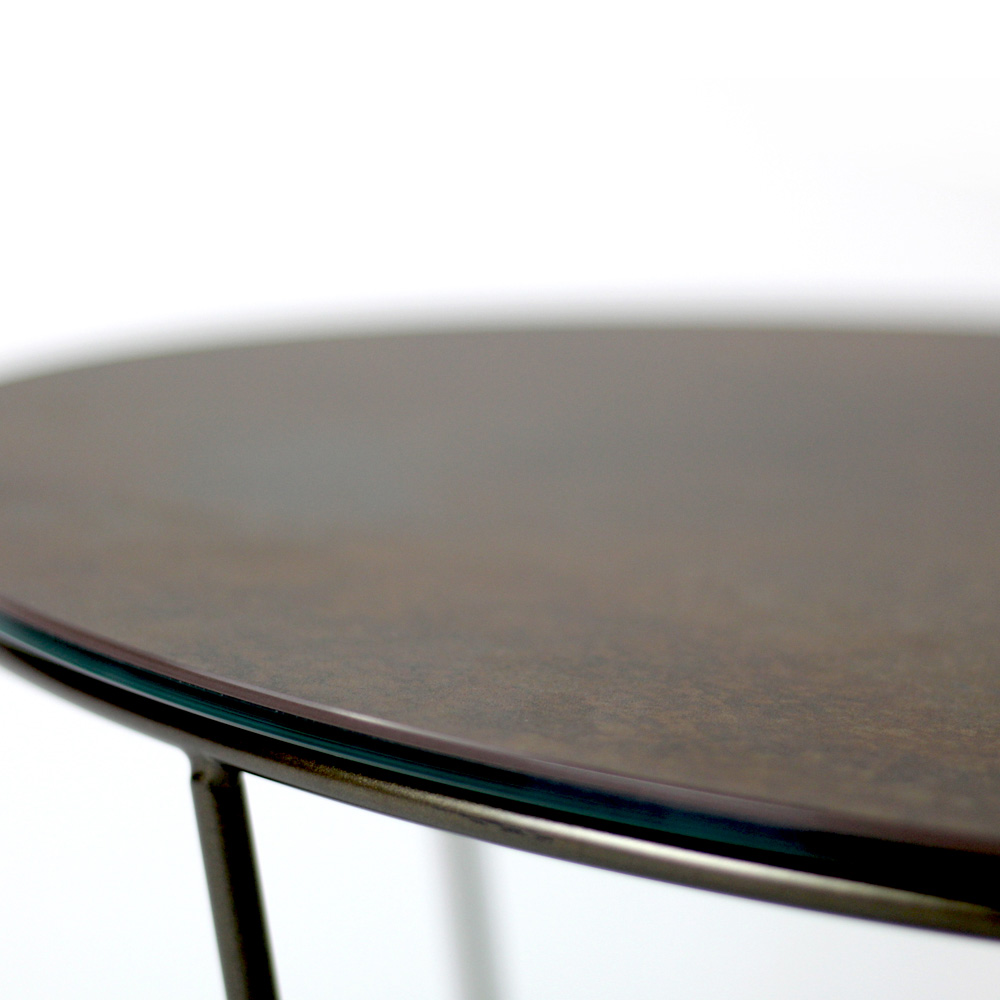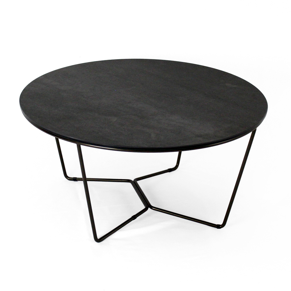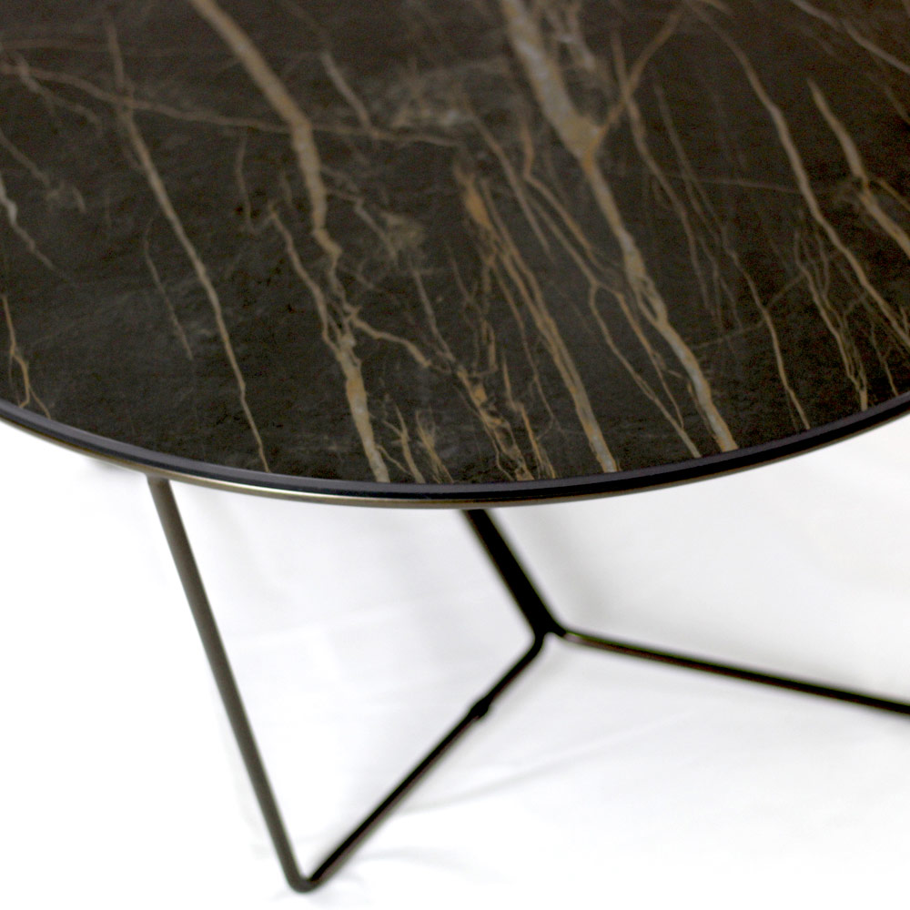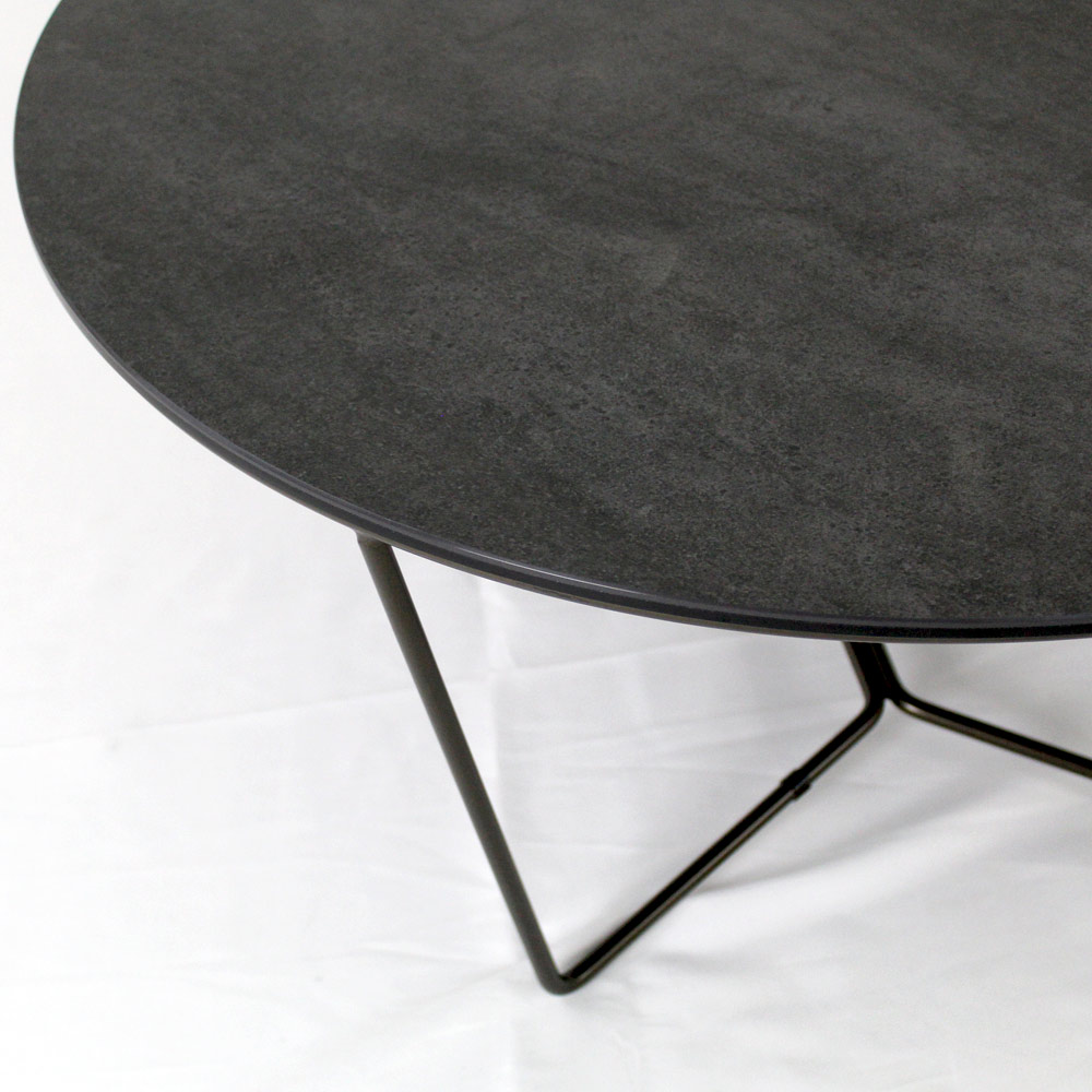 Mesita redonda con base de acero pintado y encimera de gres porcelánico.