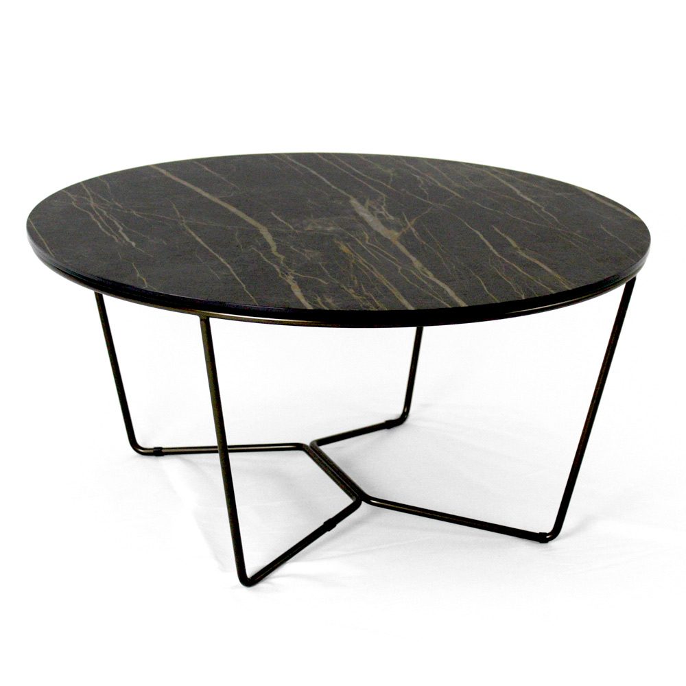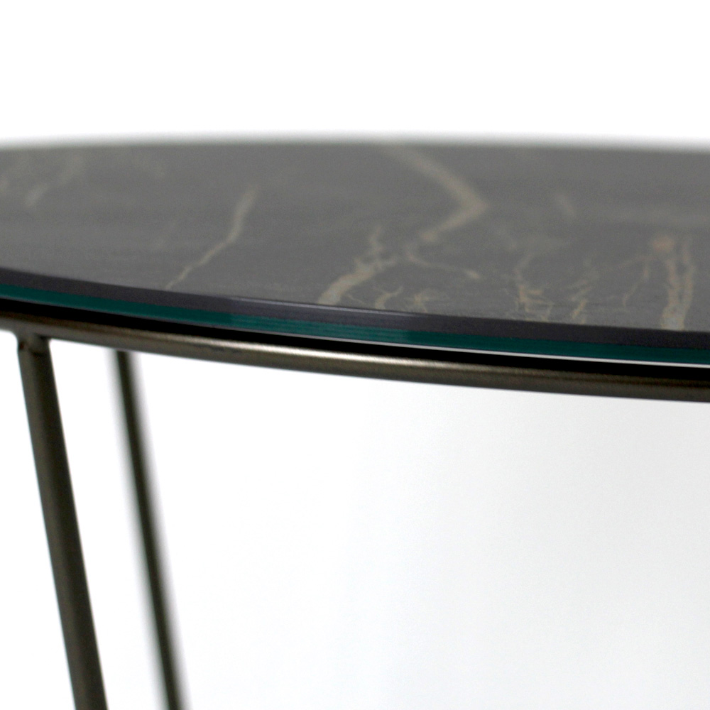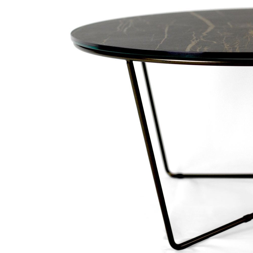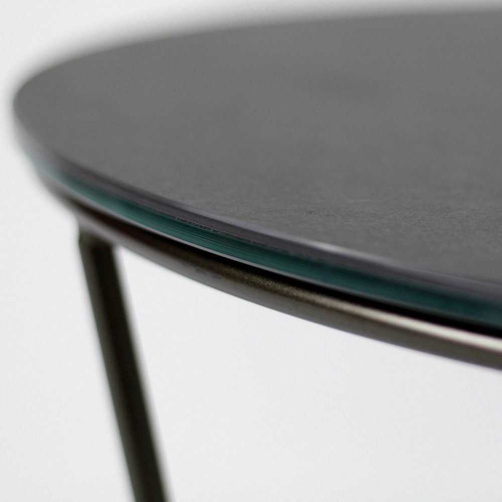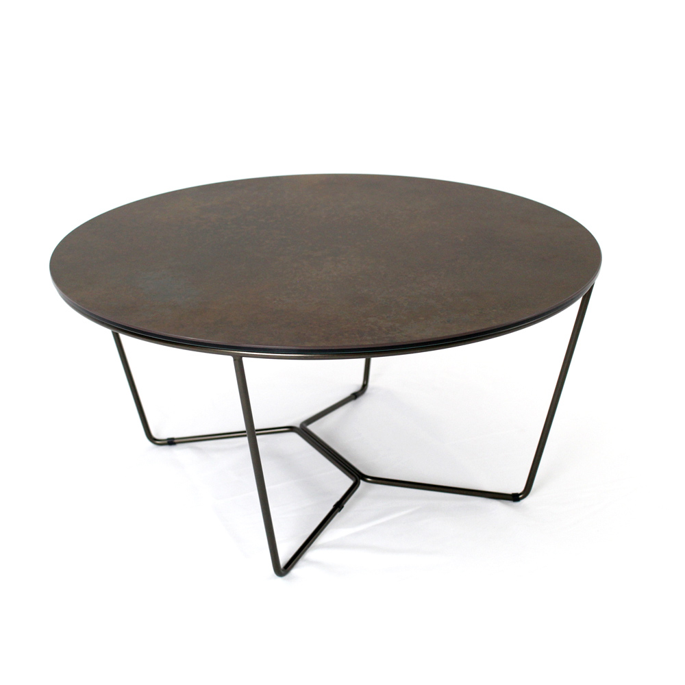 Mesita redonda con base de acero pintado y encimera de gres porcelánico.