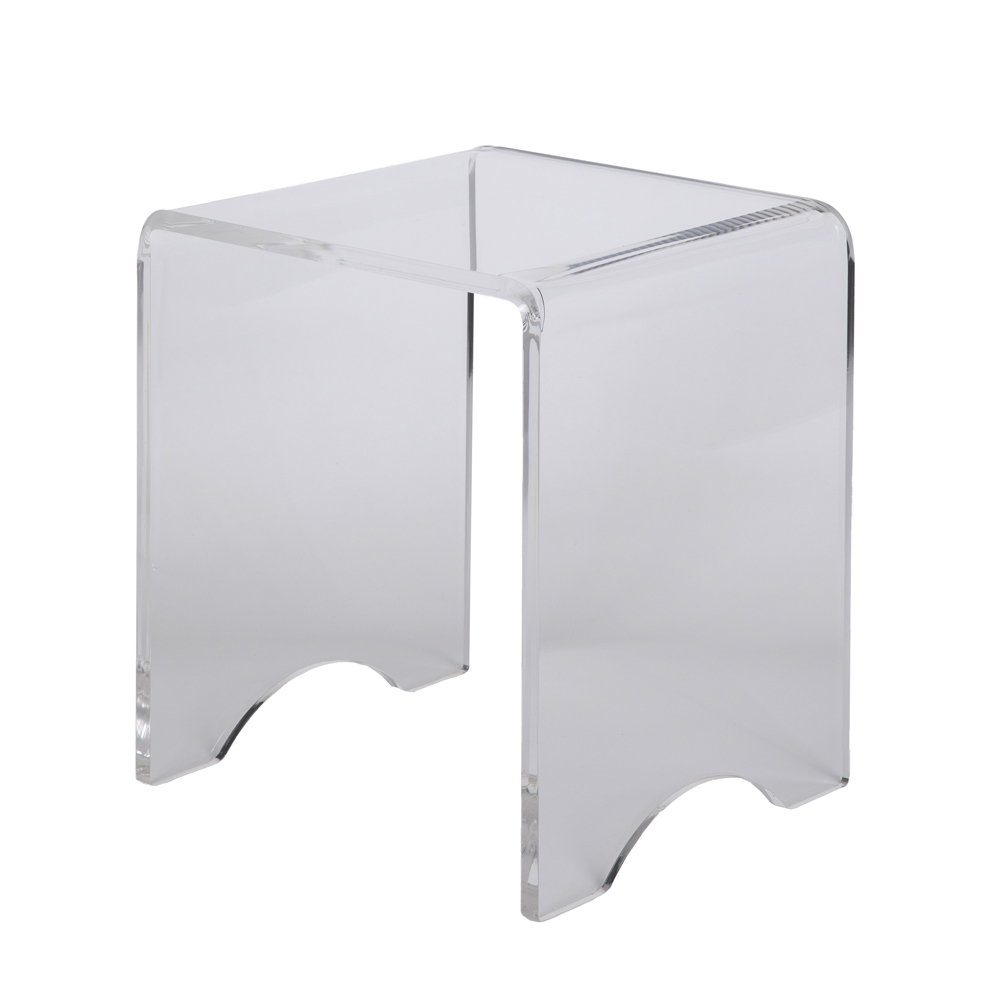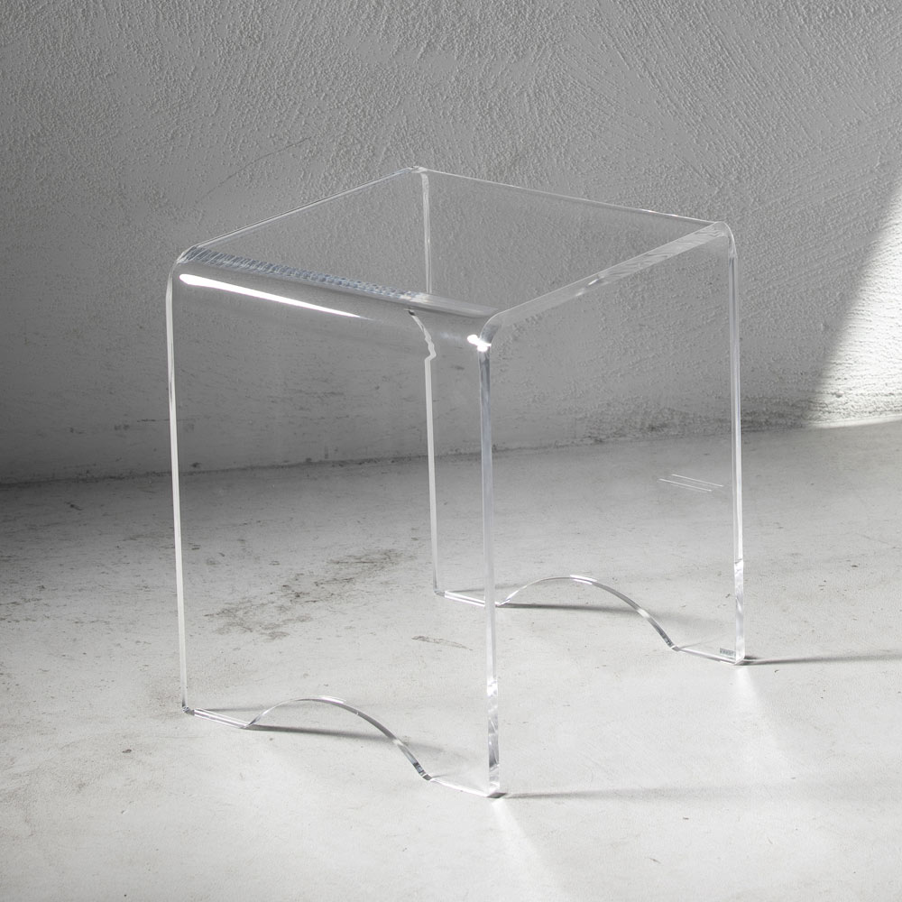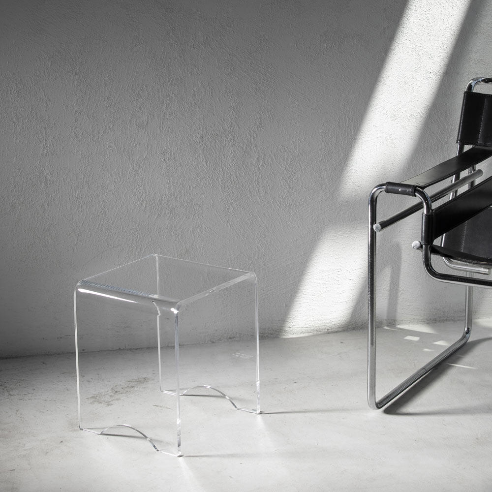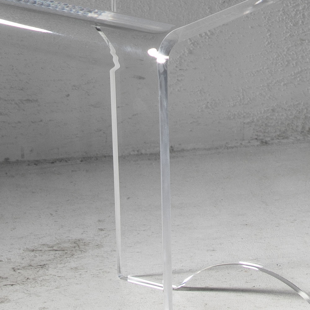 Este taburete de mesa de centro tiene un diseño versátil con líneas puras y minimalistas y está íntegramente realizado en cristal acrílico transparente cortado con láser en todo el perímetro lo que le da un brillo extraordinario.