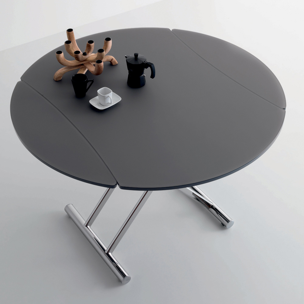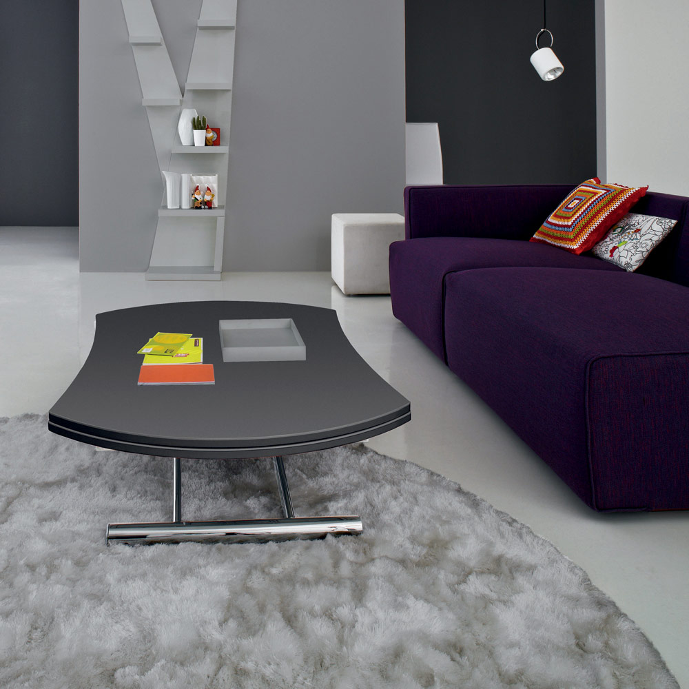mesa de centro se convierte en mesa de comedor mediante un mecanismo de gas.