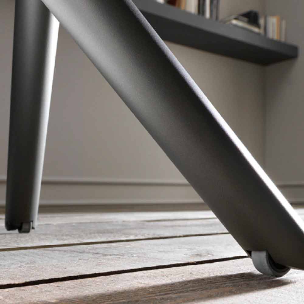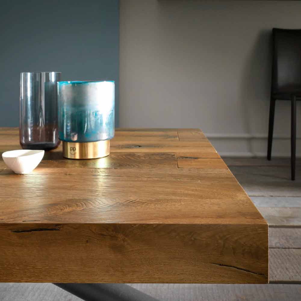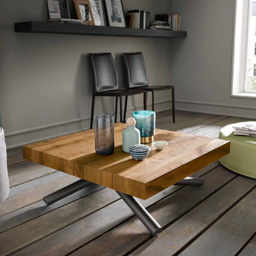 mesa de centro transformable unifica la modernidad del concepto y el diseño entrelazado de las patas de metal, con la parte más naturalista y valiosa del grueso tablero (8 cm) en roble macizo.