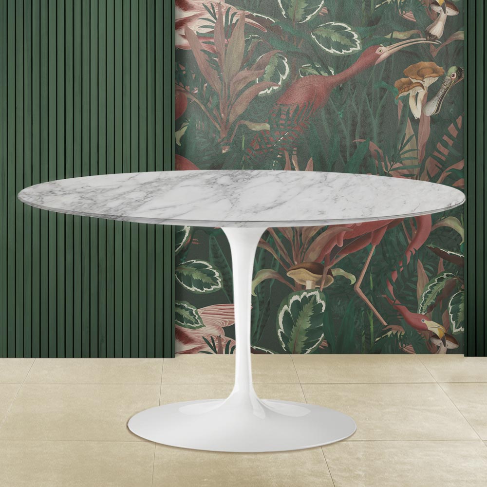 forma ovalada y el mármol arabesco utilizado para crear la tapa. La forma ovalada se utiliza cada vez más para dar a la estancia un toque de singularidad y delicadeza y aquí combina con los