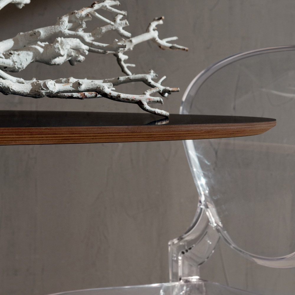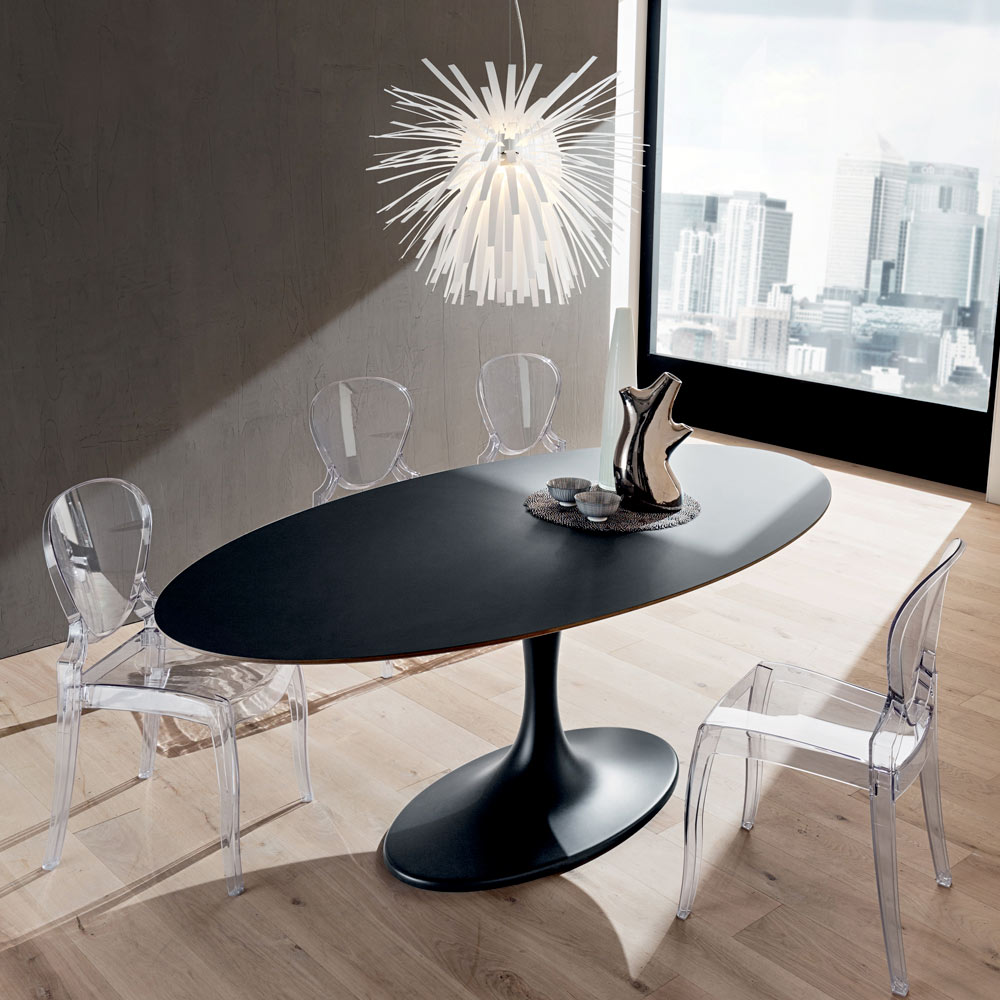 Mesa de comedor fabricada en Italia con tapa ovalada en contrachapado de abedul con superficie enchapada en acabado negro fenix y base en mármol mineral (mármol sintético). Un estilo extremadamente original y creativo caracteriza este mueble de alma elegante y estética casi futurista capaz de hacer único cualquier ambiente gracias a su personalidad particularmente innovadora . Las peculiares líneas que recorren toda la base se fusionan a la perfección con la forma ovalada de la tapa, creando así una sensación de movimiento y una espléndida armonía de formas . El particular contraste entre la tapa de madera contrachapada y el revestimiento de fenix enriquece aún más el diseño final de la mesa, haciéndola especialmente adecuada para quienes aman amueblar sus espacios de una manera sofisticada y completamente revolucionaria. Los materiales de alta calidad utilizados y la mano de obra 100% Made in Italy aumentan su calidad y valor, lo que nos permite ofrecer una solución de decoración que es tan bella y elegante como sólida, resistente y funcional.