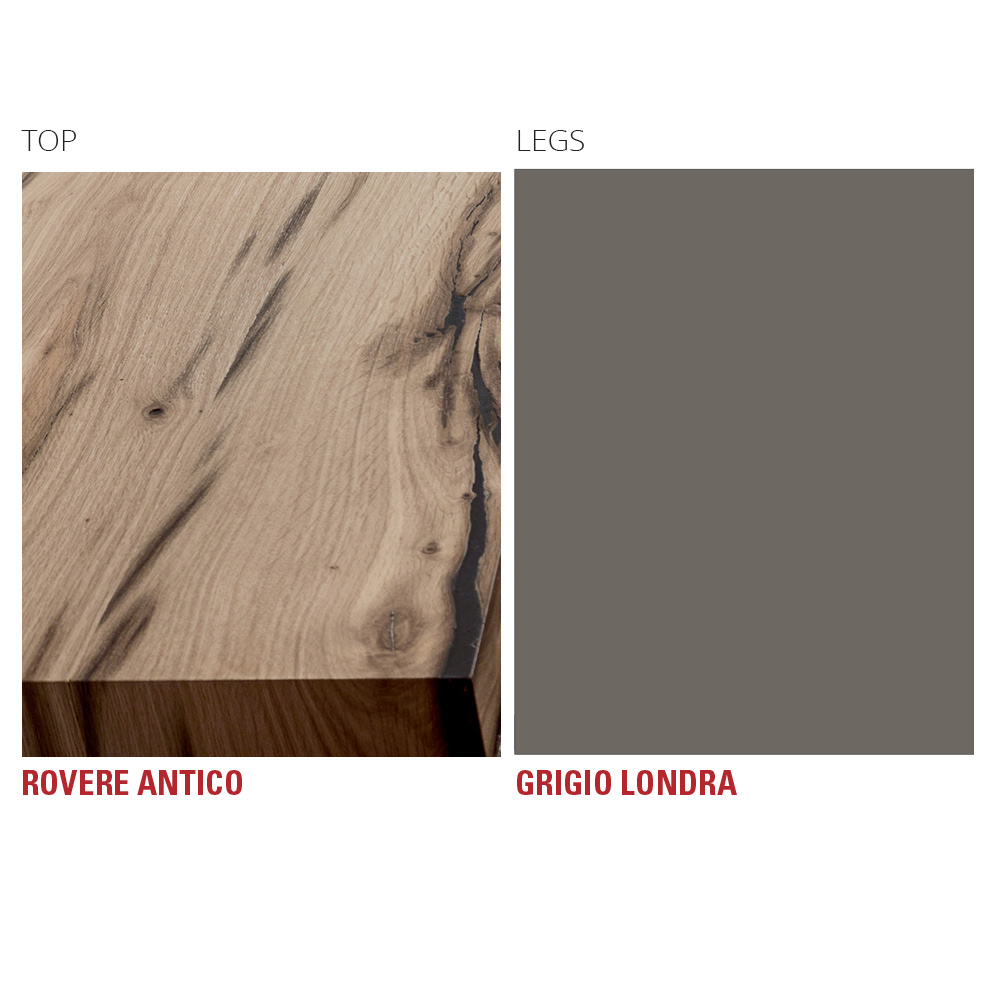 Mesa de comedor realizada con panel enchapado en acabado roble envejecido (6 cm de espesor) y patas de metal pintado con polvos epoxi. De la fabricación 100% Made in Italy y el uso de materias primas de alta calidad, nace un artículo sólido y resistente para amueblar comedores o cocinas modernas, caracterizado por un diseño imponente y majestuoso . La elegancia atemporal de la madera y sus maravillosas vetas se combinan a la perfección con una base de formas casi futuristas que confieren a la mesa su personalidad revolucionaria , creando la solución de decoración perfecta para quienes aman enriquecer sus ambientes de forma exclusiva. El espléndido acabado de la tapa también hace que este accesorio sea extremadamente funcional gracias también a los tres colores disponibles para la base que permiten crear combinaciones discretas y elegantes capaces de responder a cada necesidad y exigencia con estilo y un toque exclusivo .