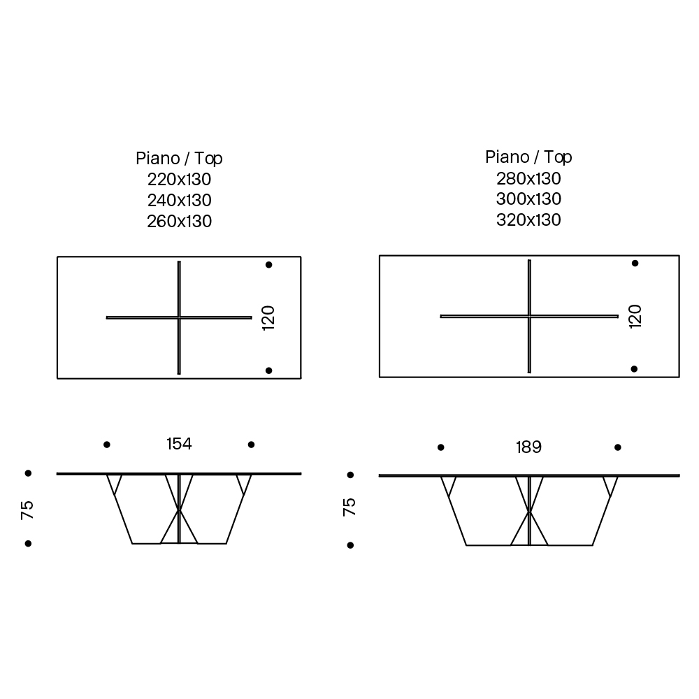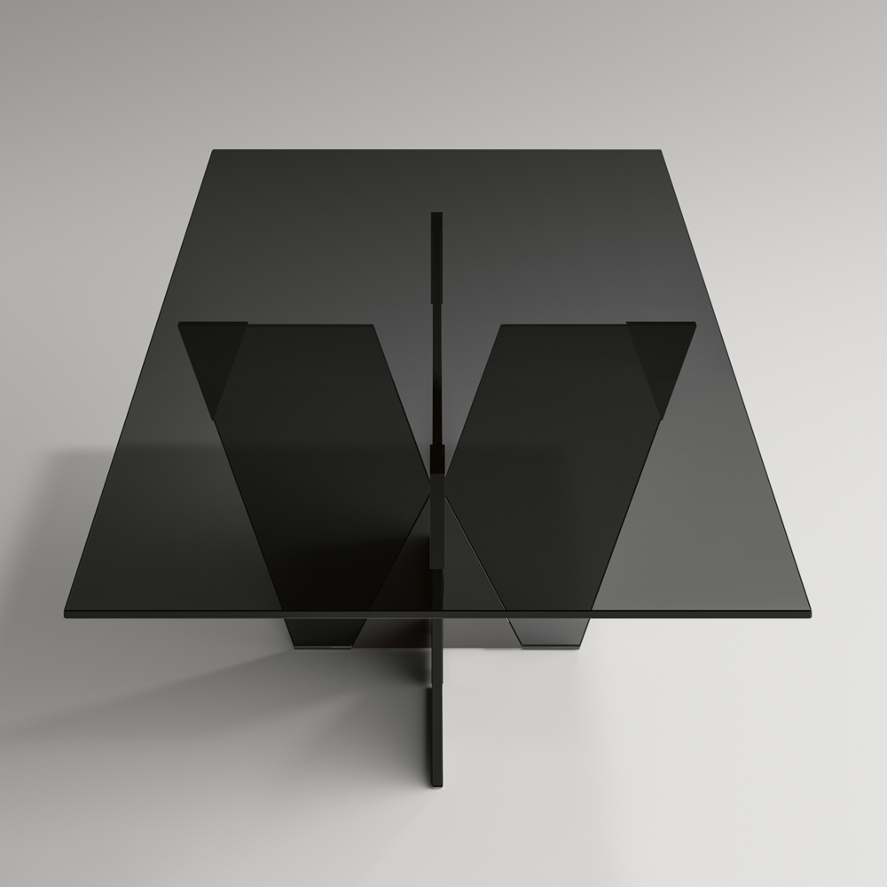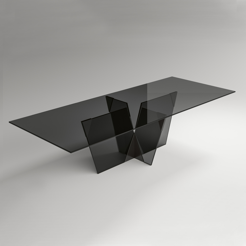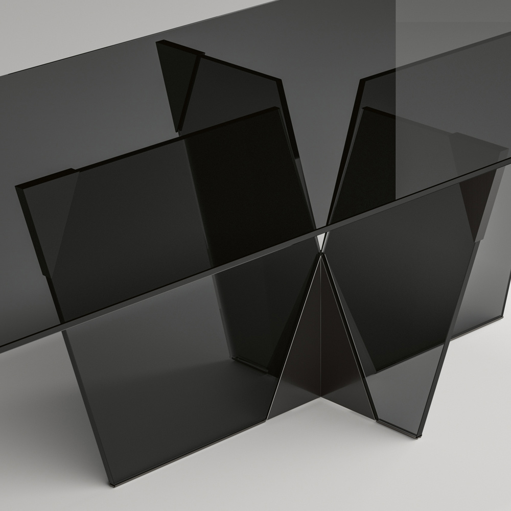 estructura elegante y escultórica , este mueble nace de la combinación de materiales de diferente naturaleza junto con la pasión por el procesamiento del vidrio, logrando así definir una representación de fuerza y carácter a través de diferentes formas y espesores. El punto fuerte de su estética es la base arquitectónica caracterizada por una junta piramidal de metal que constituye la parte esencial del producto. Los elementos metálicos completan el diseño de la mesa dando forma al vidrio de la base y enriqueciéndolo con personalidad y originalidad.