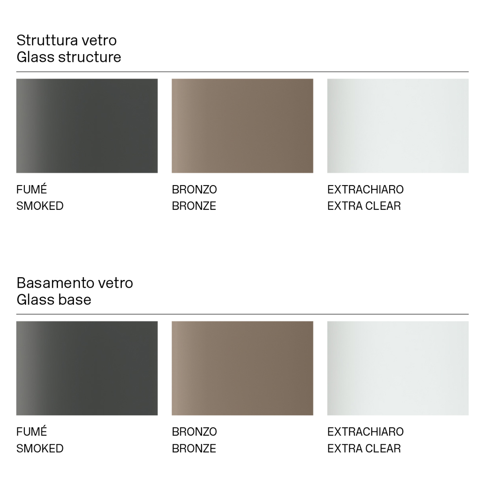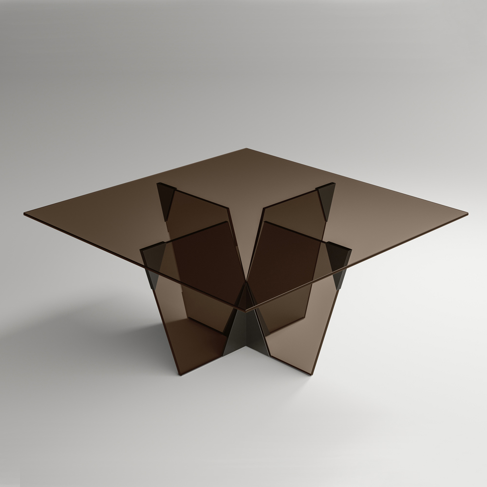 estructura elegante y escultural que surge de la combinación de materiales de diferente naturaleza junto con la pasión por el procesamiento del vidrio, logrando así definir una representación de fuerza y carácter a través de diferentes formas y espesores. El punto fuerte de su estética es la base arquitectónica caracterizada por una junta piramidal de metal que constituye la parte esencial del producto. Los elementos metálicos completan el diseño de la mesa dando forma al vidrio de la base y enriqueciéndolo con personalidad y originalidad.