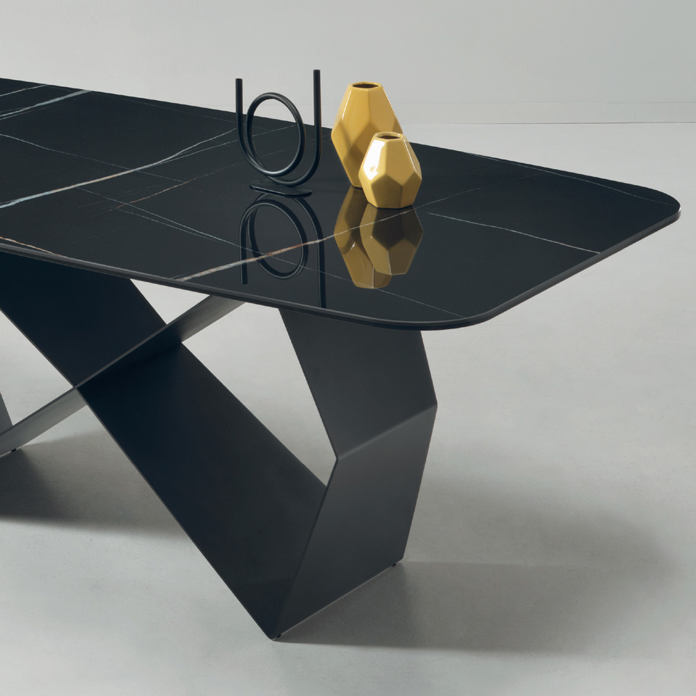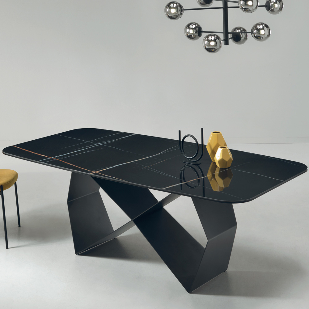 Mesa de comedor íntegramente fabricada en Italia con tapa de cerámica efecto mármol y estructura de metal pintado de negro . Un mueble de gusto contemporáneo caracterizado por formas geométricas simples que se unen para crear una armonía única en comedores o cocinas modernas. La peculiaridad de esta mesa es sin duda la original conformación de la estructura que crea un efecto visual único capaz de conquistar con personalidad el entorno que la rodea, convirtiéndose en su verdadero protagonista. La elegante encimera de cerámica efecto mármol enriquece aún más su estética para un resultado refinado con un carácter creativo y cautivador .