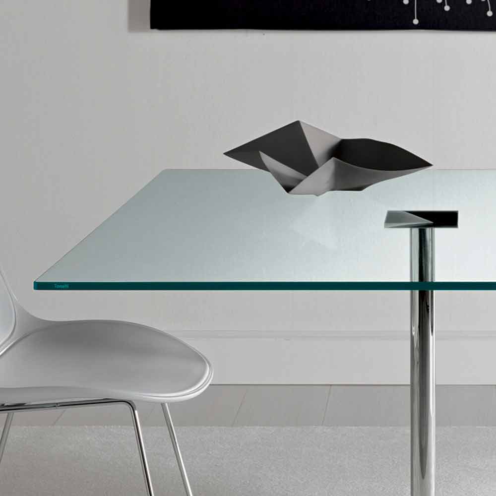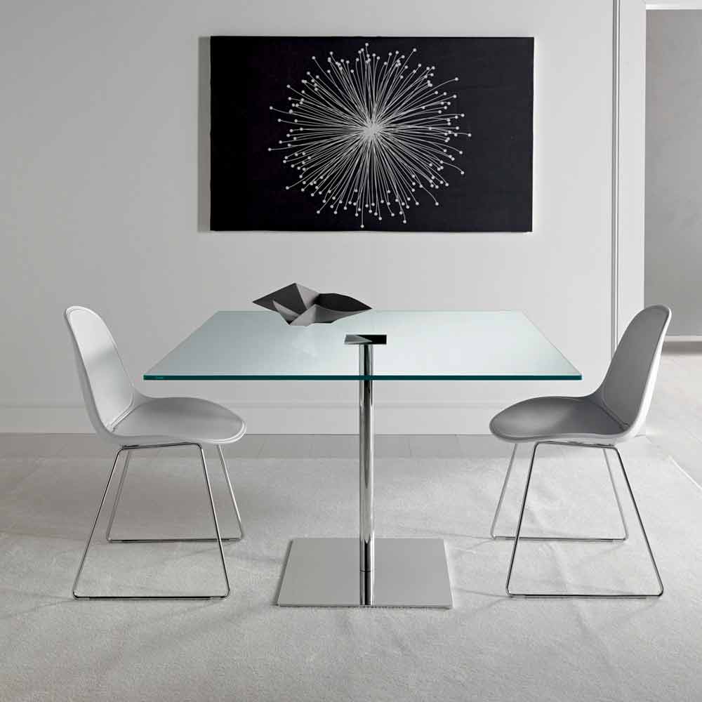 Mesa de comedor cuadrada de lujo con sobre de cristal extra claro y base de metal cromado, fabricado en Italia.