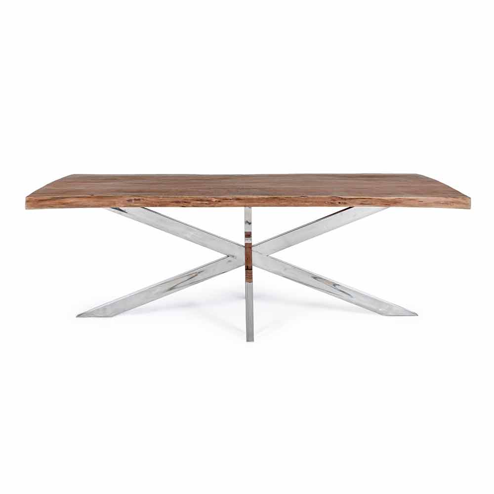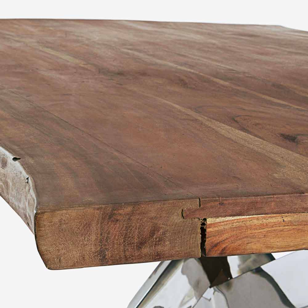 Mesa de comedor de diseño fabricada en madera y acero inoxidable.