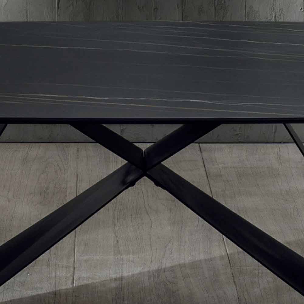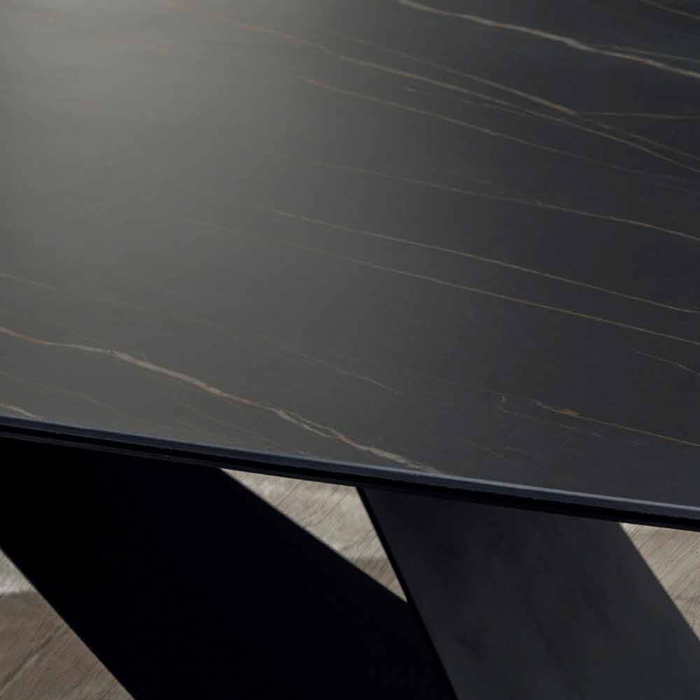 Esta mesa de comedor es un producto de fuerte impacto visual capaz de conquistar el centro del escenario con gran elegancia. Su estructura es de metal pintado antracita mate mientras que la encimera está formada por una capa superior de cerámica pura con efecto portoro de 6 mm de espesor bajo la cual se aplica una capa de vidrio de 8 mm de espesor que confiere flexibilidad a la cerámica permitiendo así evitar daños . Además, gracias a su gran tamaño, la mesa tiene capacidad para hasta 10 personas , lo que permite realizar almuerzos y cenas con amigos. Lo que distingue a este artículo es sin duda el particular diseño de la base que, gracias a los juegos geométricos creados por las placas metálicas, le da movimiento y carácter a la mesa. La combinación de materiales y acabados seleccionados permite obtener un producto final con un diseño extremadamente moderno, ideal para amueblar estancias con un gusto sofisticado y elegante .