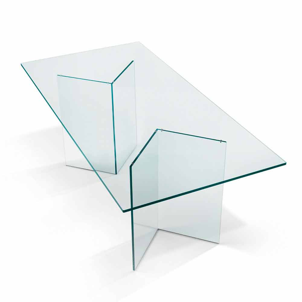 Esta mesa de comedor rectangular está realizada íntegramente en vidrio extraclaro, con una estructura compuesta por dos soportes de vidrio que se pueden disponer en paralelo o especular según el uso.