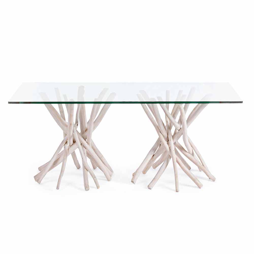 Mesa de comedor de diseño fabricada en vidrio templado y teca blanqueada.
