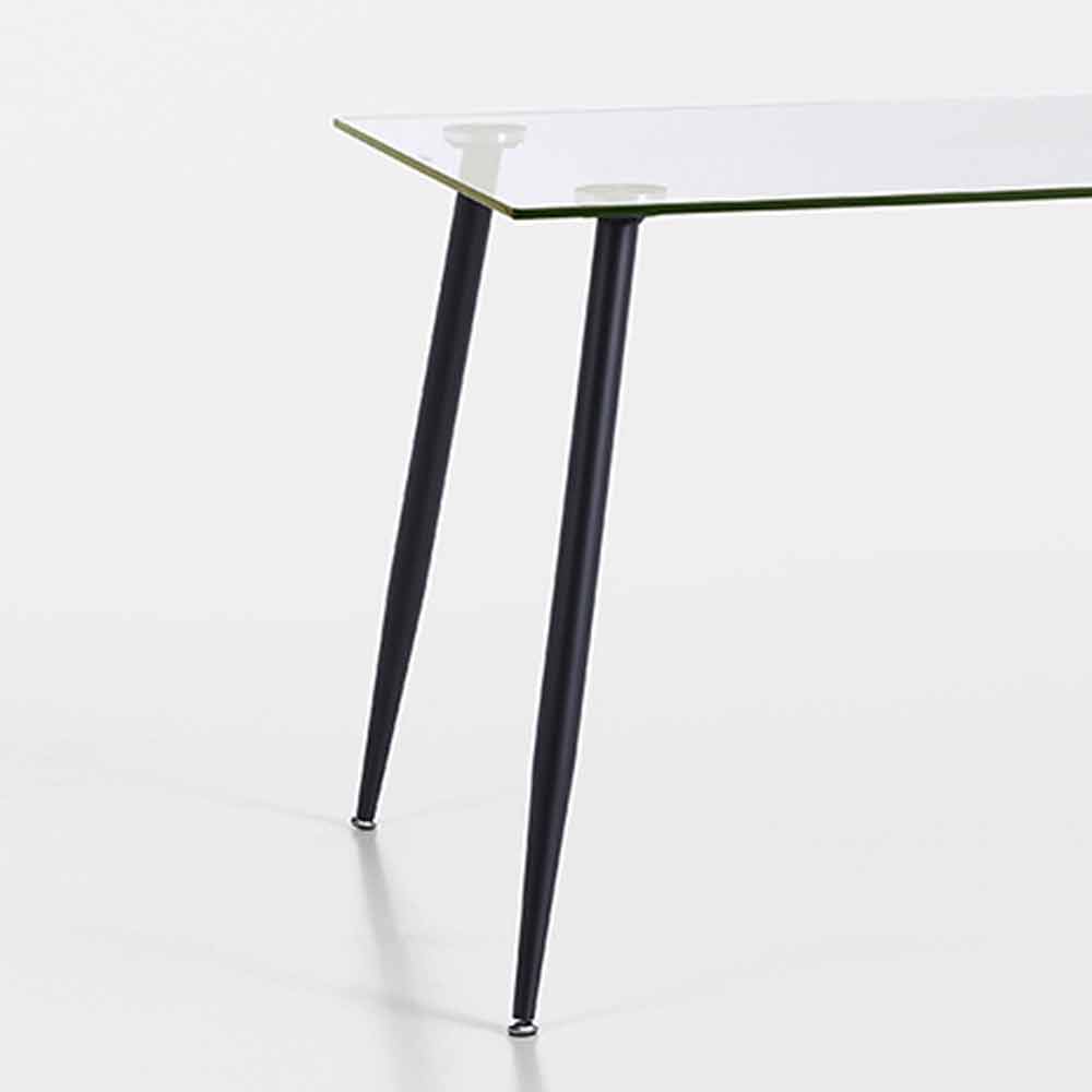 Mesa de salón de diseño moderno con tapa de cristal templado y base de metal pintado en negro mate.