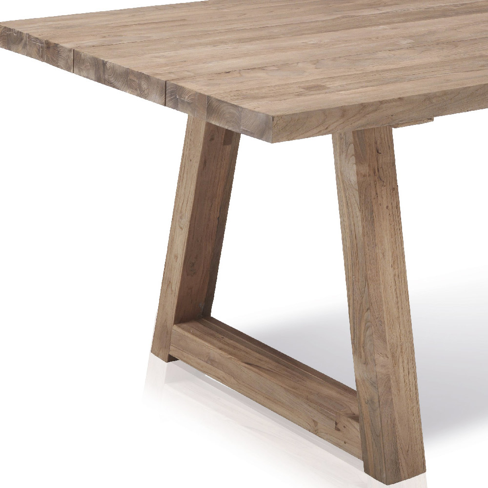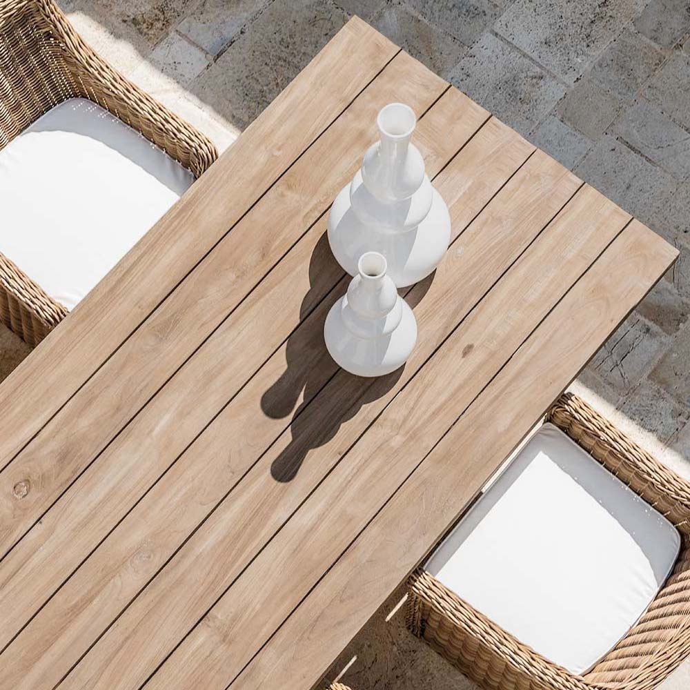 Mesa de comedor para jardín fabricada con madera de teca reciclada, elaborada íntegramente en Italia. Gracias a su material resistente a la intemperie, esta mesa es ideal para cualquier espacio exterior, desde el salón hasta el comedor, e incluso junto a la piscina. Sus acabados sencillos y lineales la convierten en una opción original para quienes buscan amueblar su espacio exterior con gusto y estilo, sin renunciar a la funcionalidad y la practicidad.