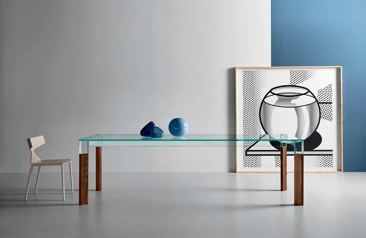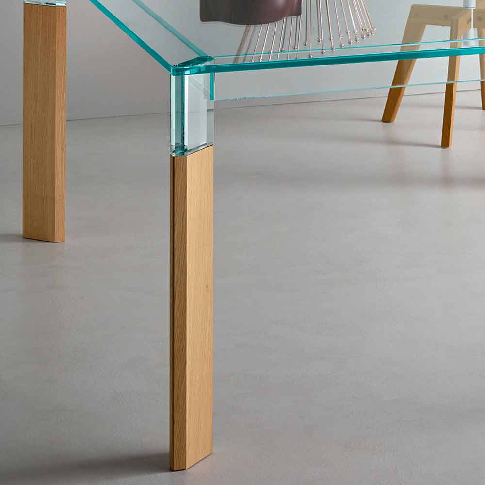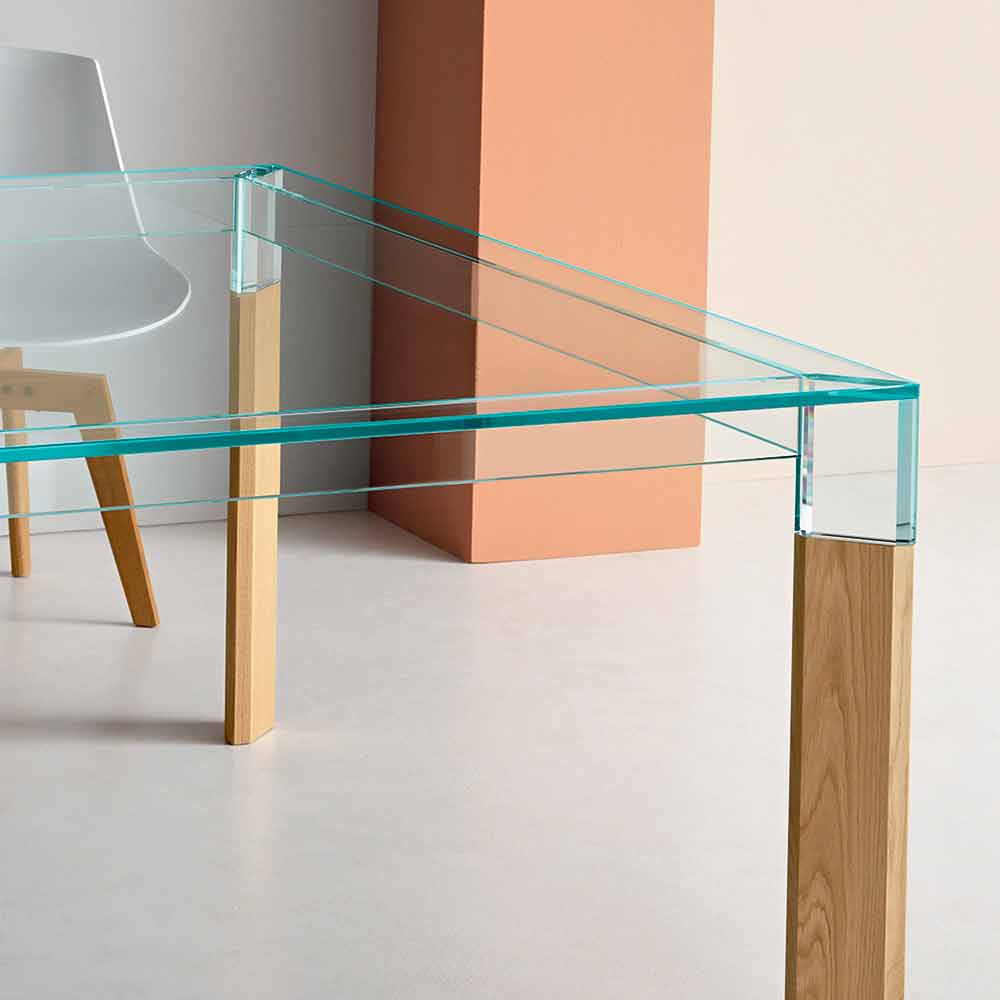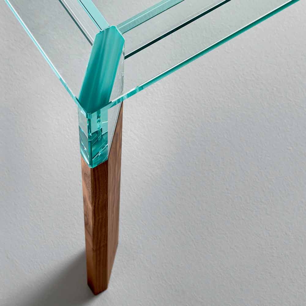 Mesa de comedor de diseño de lujo con sobre de cristal extra claro y base de madera maciza, hecha en Italia.