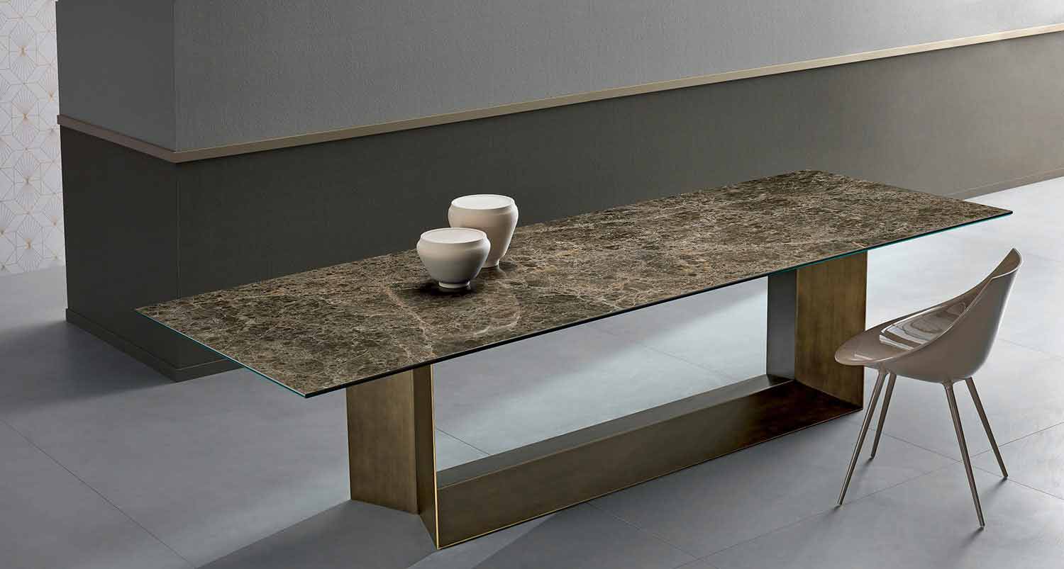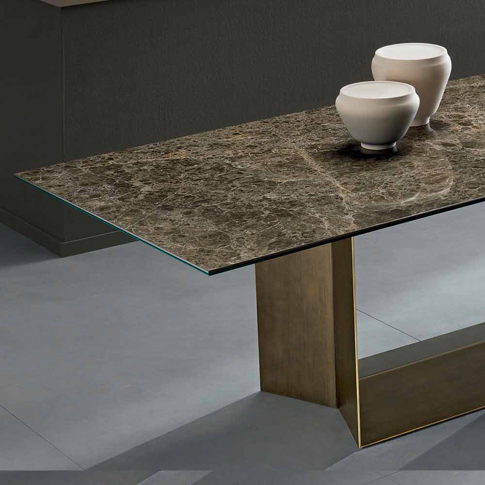 Mesa de cocina de lujo con encimera de cerámica Emperador pulido y base de metal de bronce cepillado, hecha en Italia.
