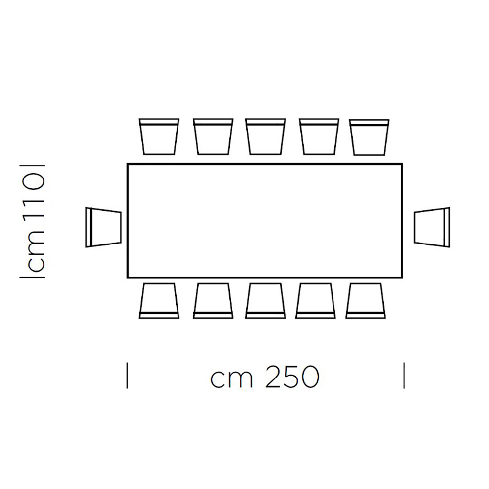 • L 250 x P 110 x Al 75,5 cm (12 asientos).