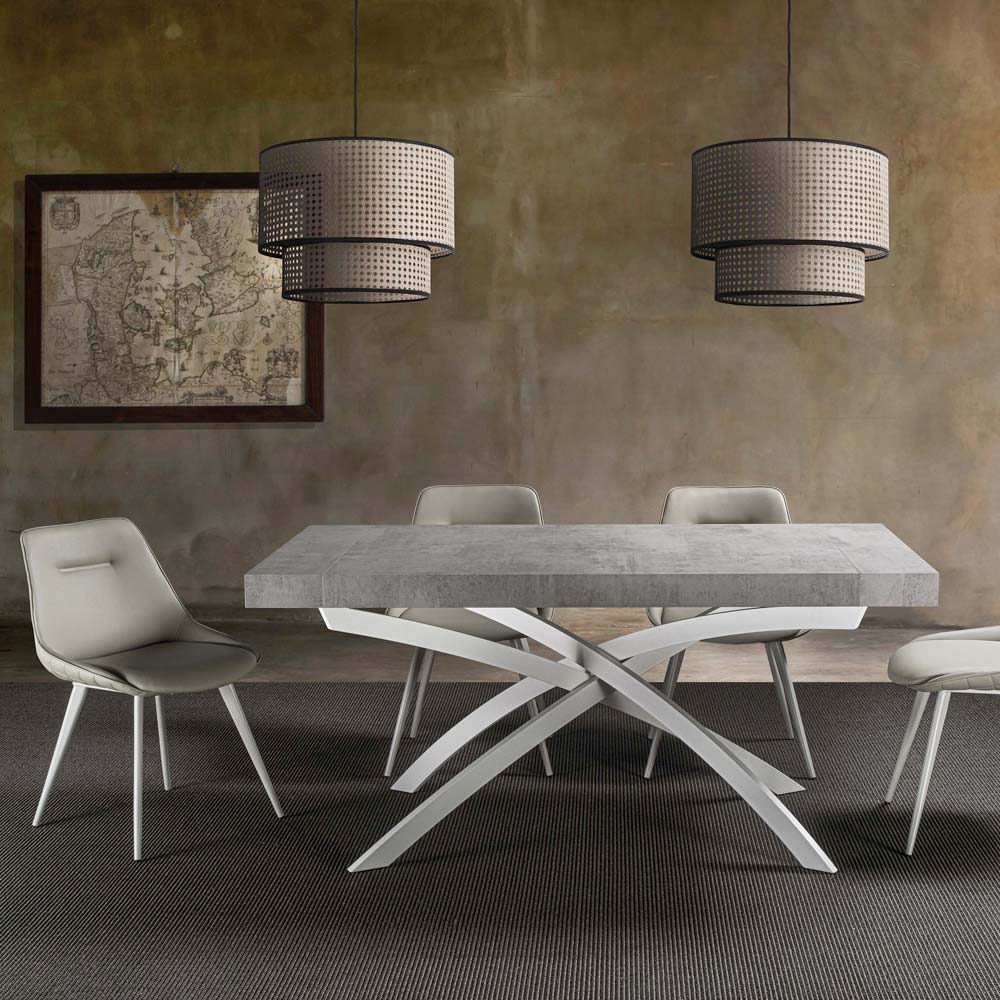 Mesa de comedor de estilo contemporáneo fabricada en madera de melamina con base de metal pintado . La tapa tiene la posibilidad de extenderse hasta un máximo de 280 cm gracias a las dos extensiones del mismo color colocadas en el interior de la mesa. Gracias a esta característica, la mesa resulta extremadamente funcional permitiendo, si es necesario, acomodar a un mayor número de comensales y permitiendo un fácil y rápido cierre de la tapa para optimizar los espacios de la mejor manera. La forma particular de la estructura también le da a la mesa un toque único, creando una maravillosa armonía entre las formas y una innovadora sensación de movimiento.