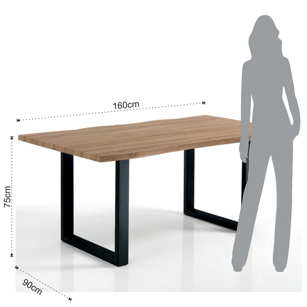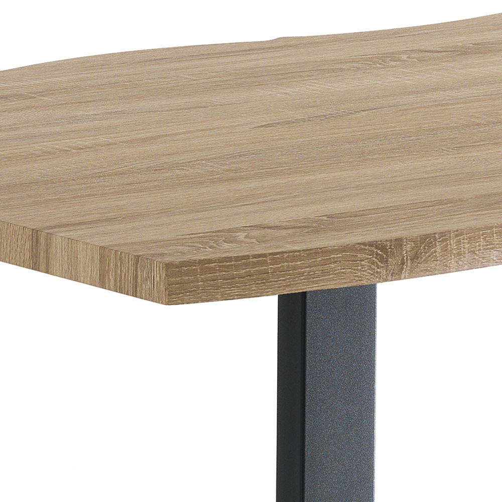 Mesa de comedor en mdf acabado roble con patas de acero negro.