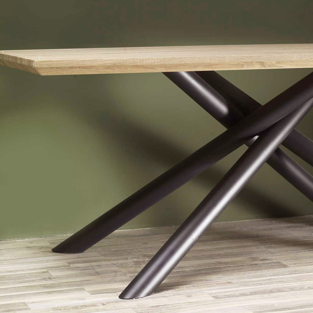 Esta mesa de diseño contemporáneo es la combinación perfecta de elegancia y funcionalidad . El marco de metal con recubrimiento en polvo negro asegura una base resistente y estable, realzada por las líneas geométricas de las patas cruzadas, que dan a la mesa un toque de refinado estilo industrial .