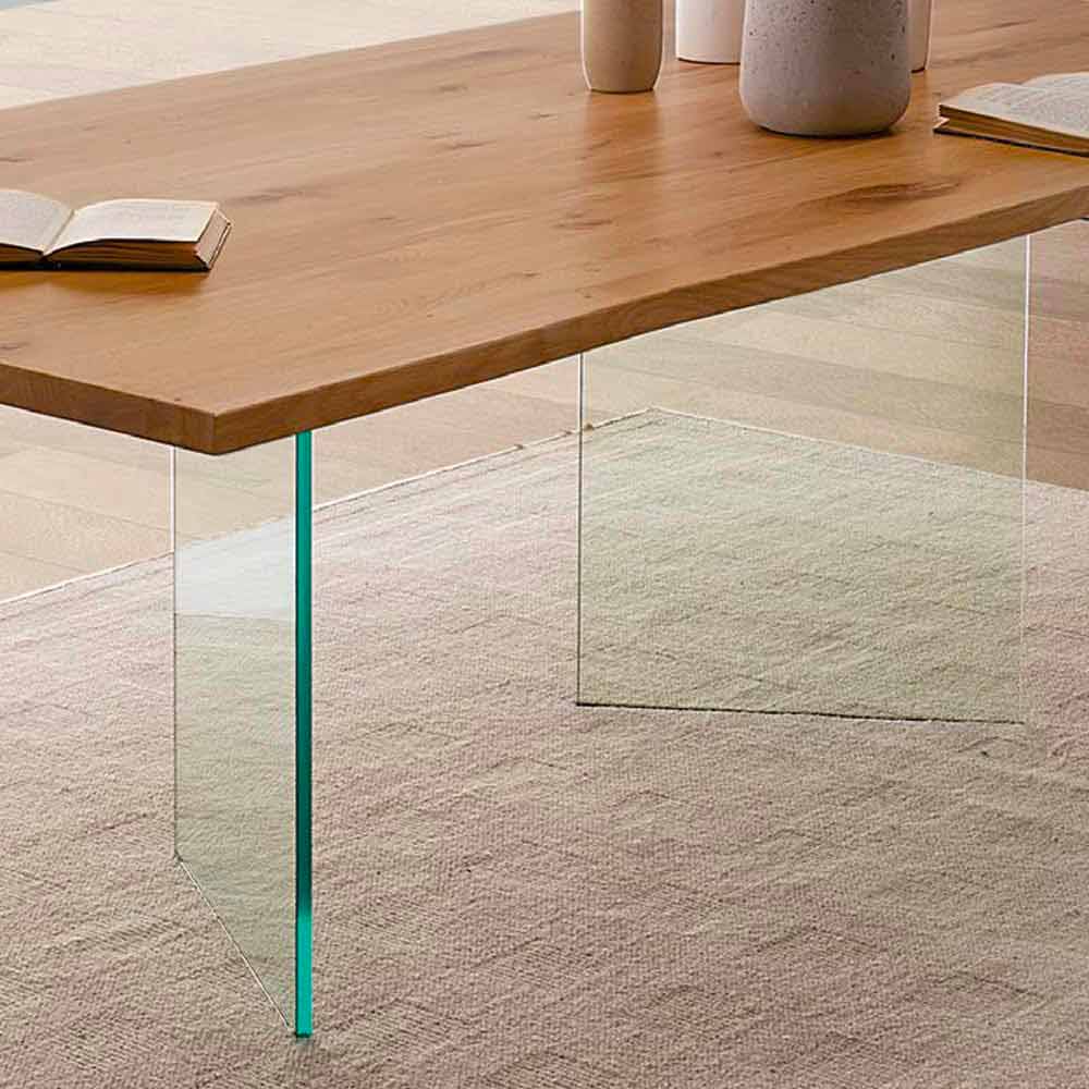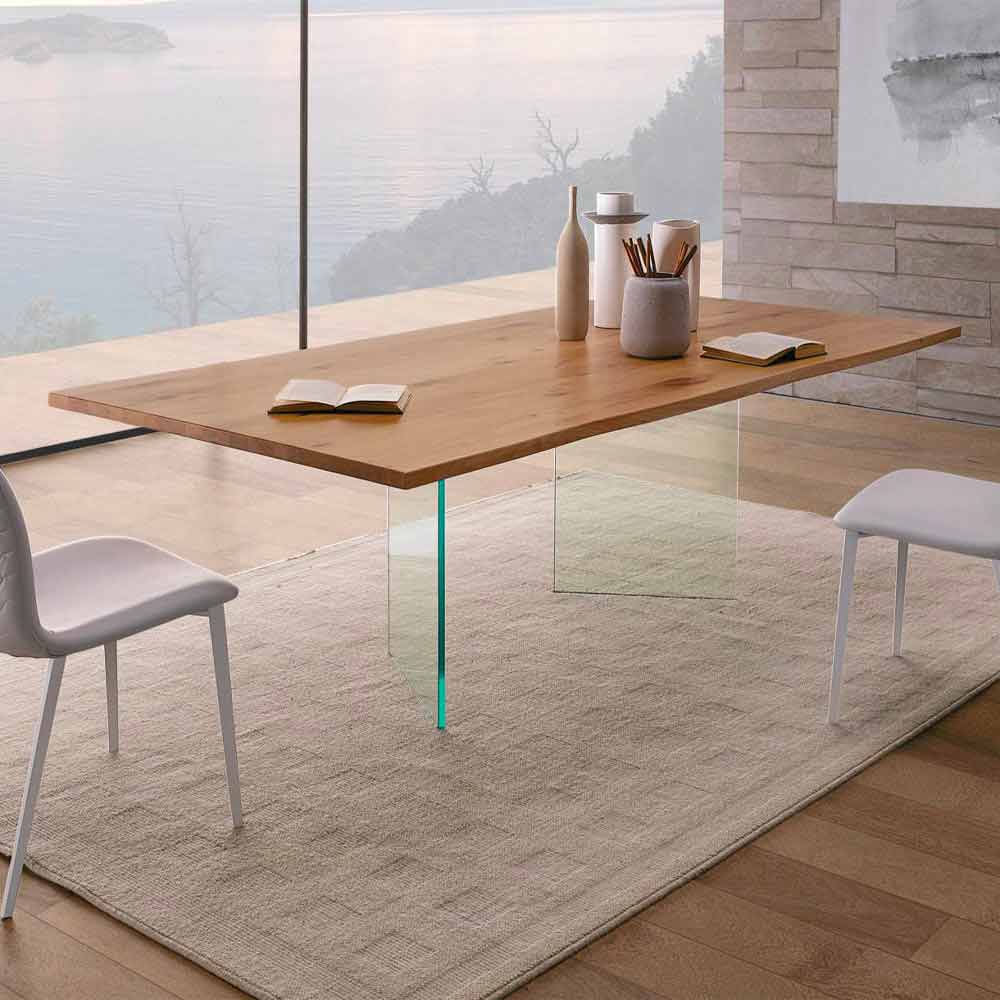 Mesa de comedor moderna fabricada en vidrio y madera, producto Made in Italy de alta calidad.