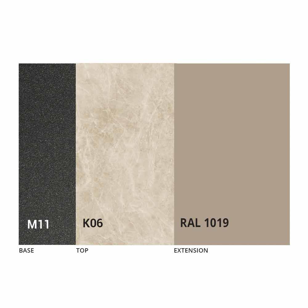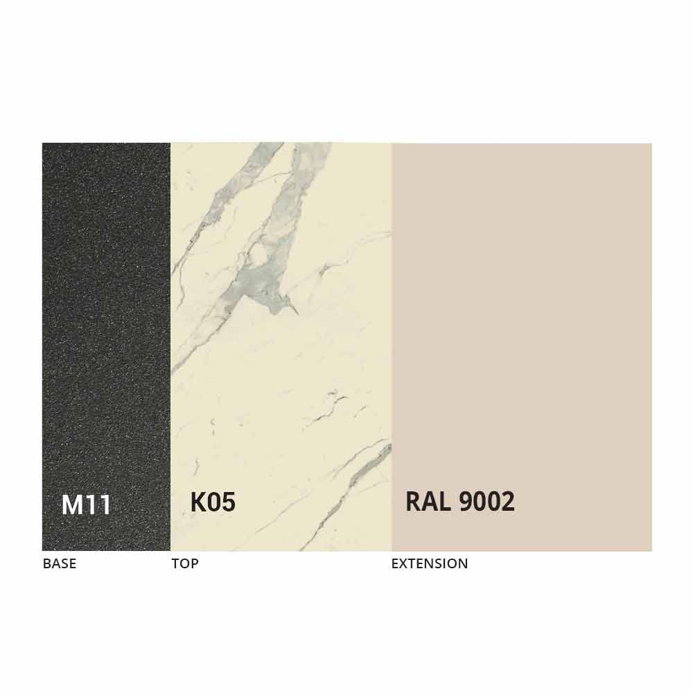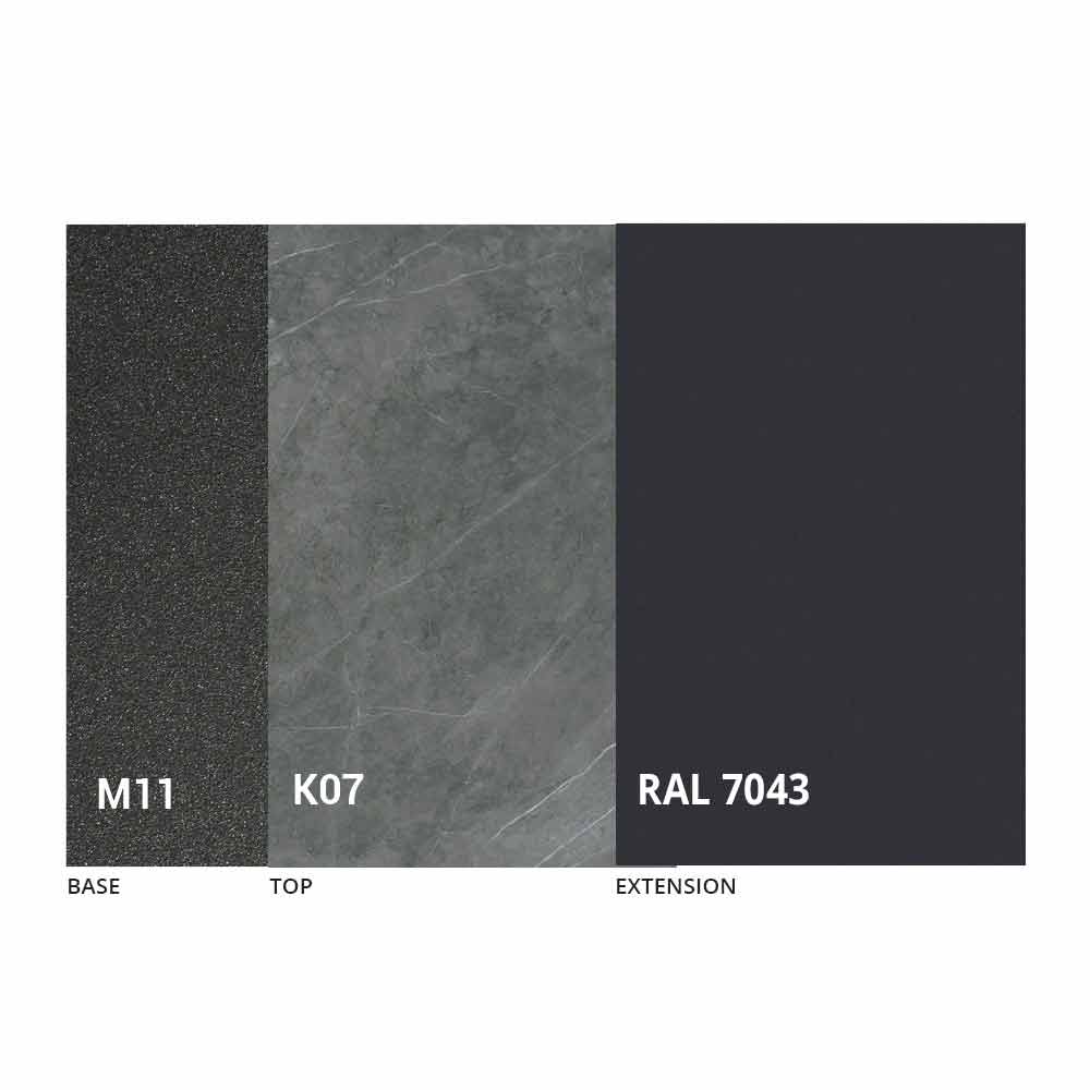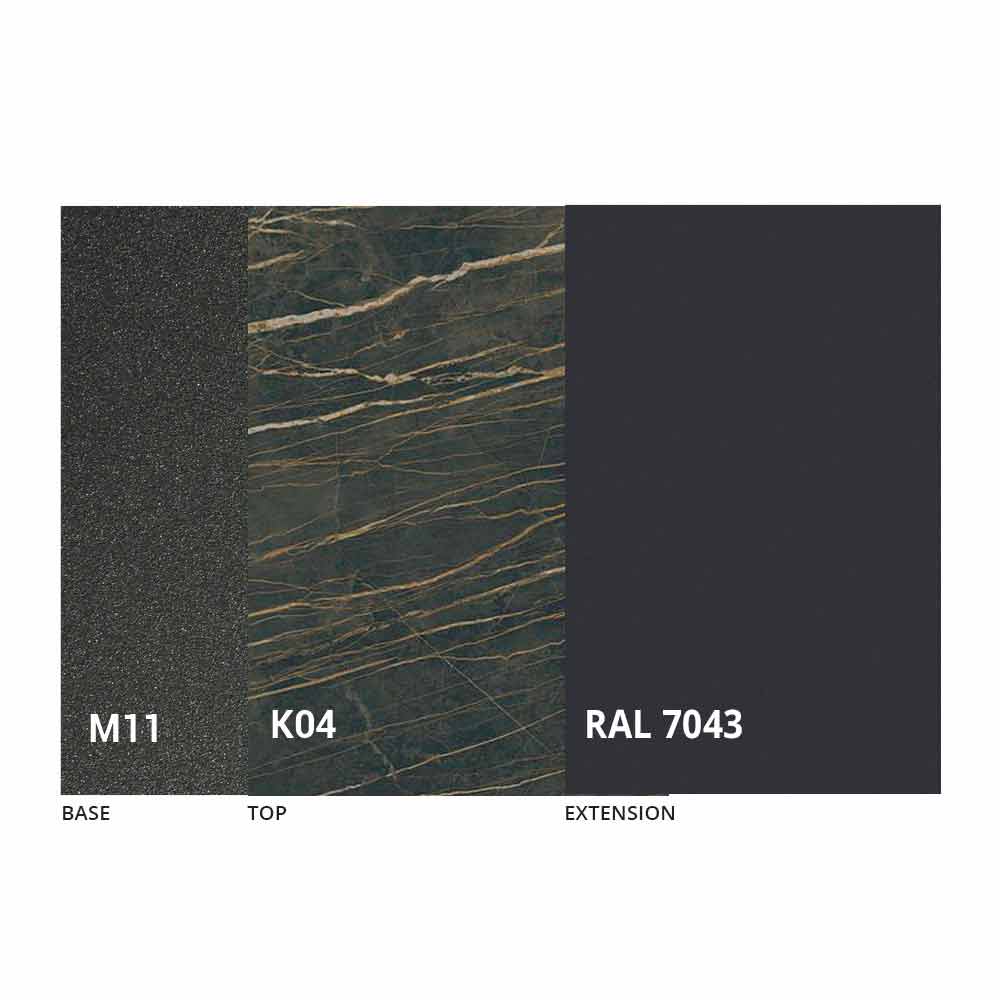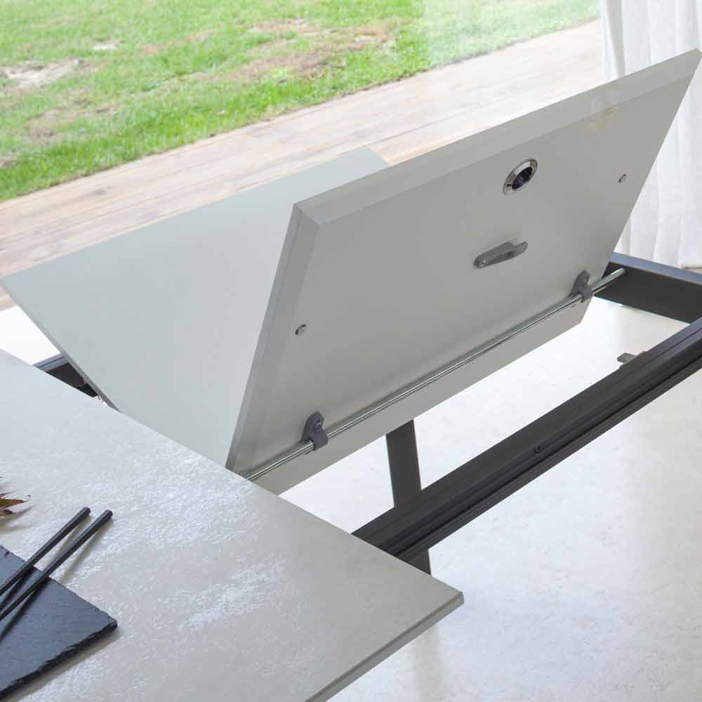 Caracterizado por una tapa de cerámica laminada sobre un panel de melamina y una base de metal pintado en grafito gofrado, la tapa se puede extender gracias a un mecanismo telescópico con una extensión plegable interna en el mismo color que el panel inferior.