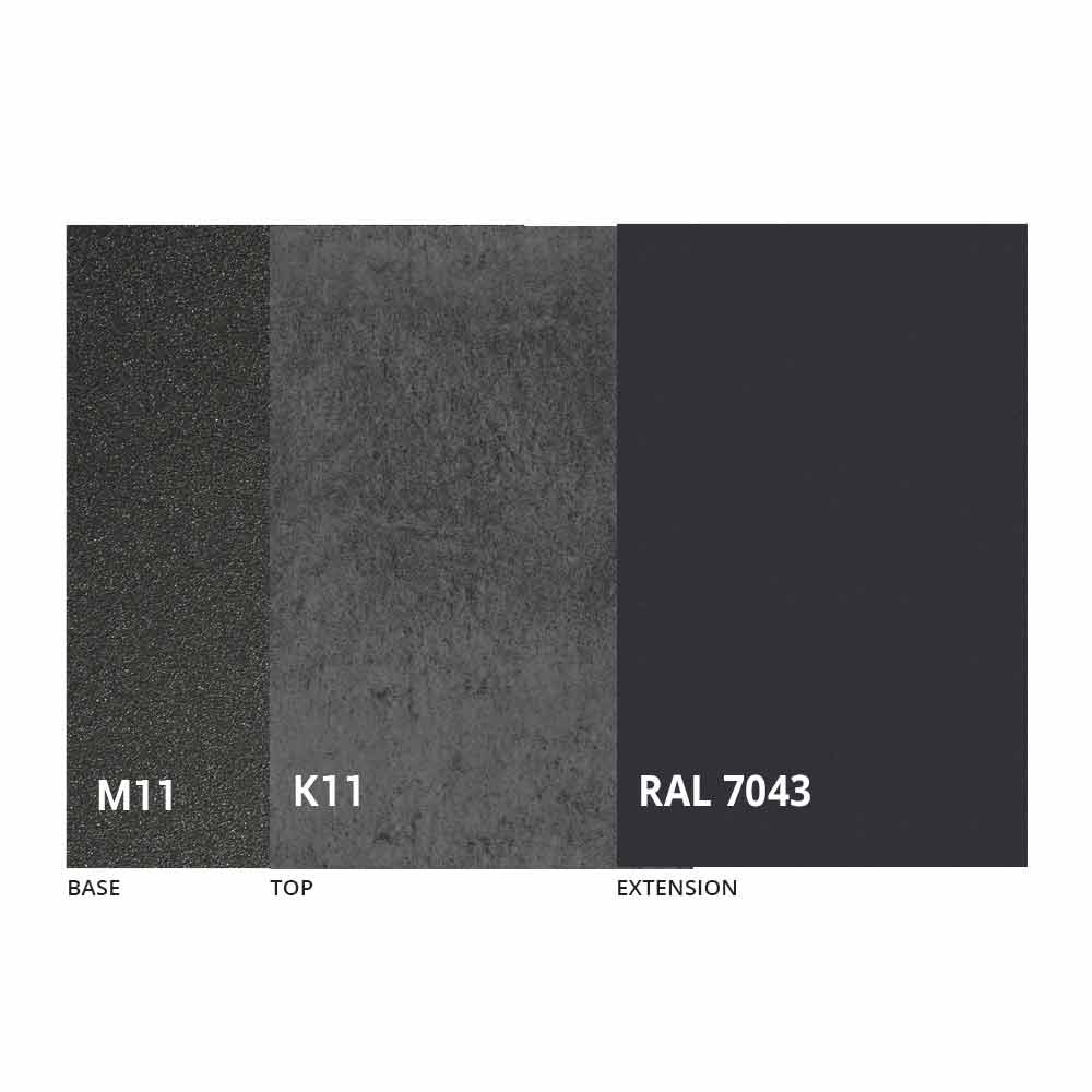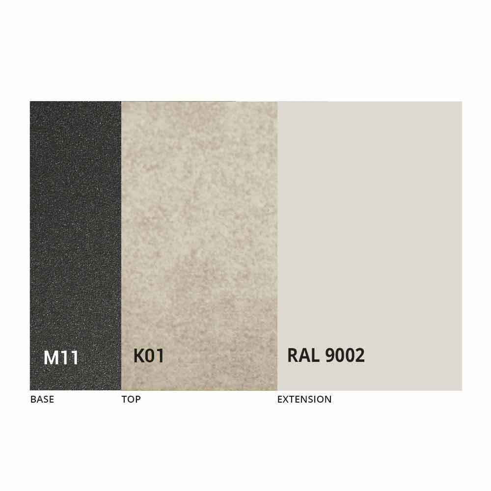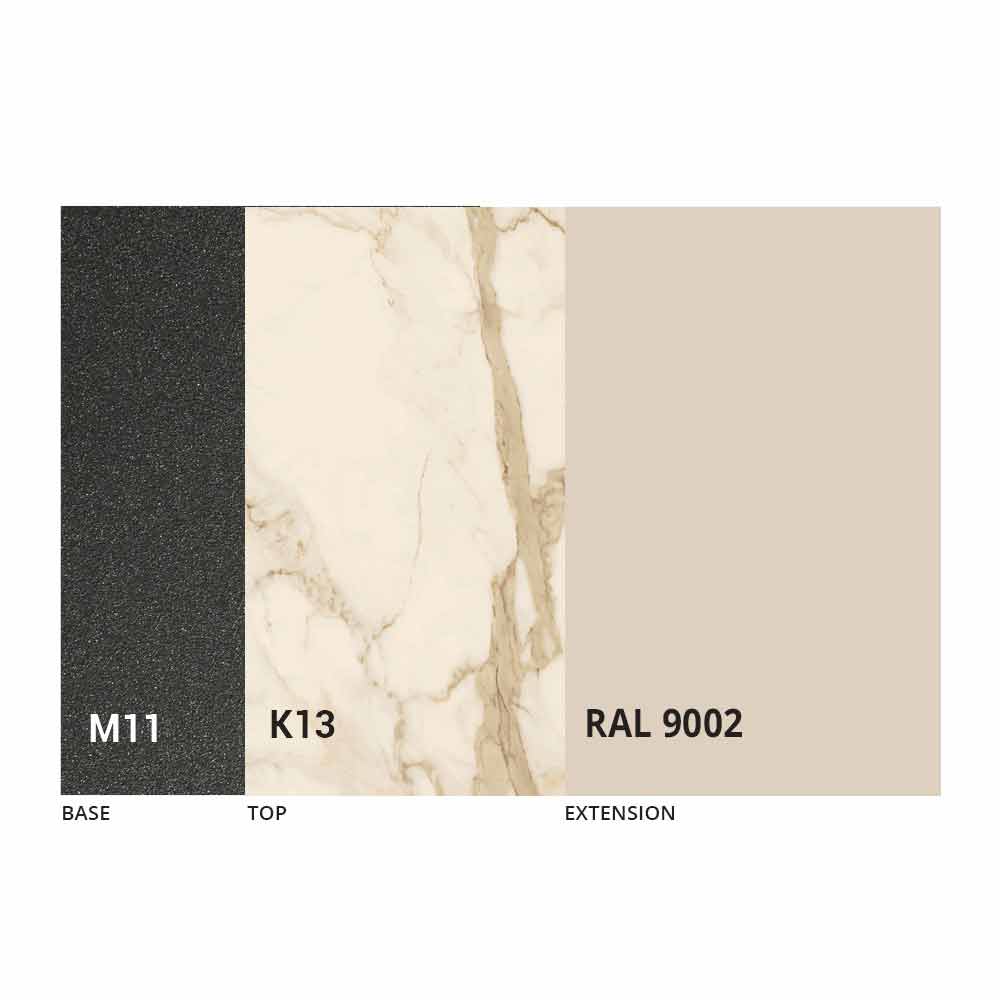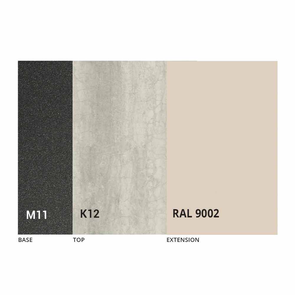 Caracterizado por una tapa de cerámica laminada sobre un panel de melamina y una base de metal pintado en grafito gofrado, la tapa se puede extender gracias a un mecanismo telescópico con una extensión plegable interna en el mismo color que el panel inferior.