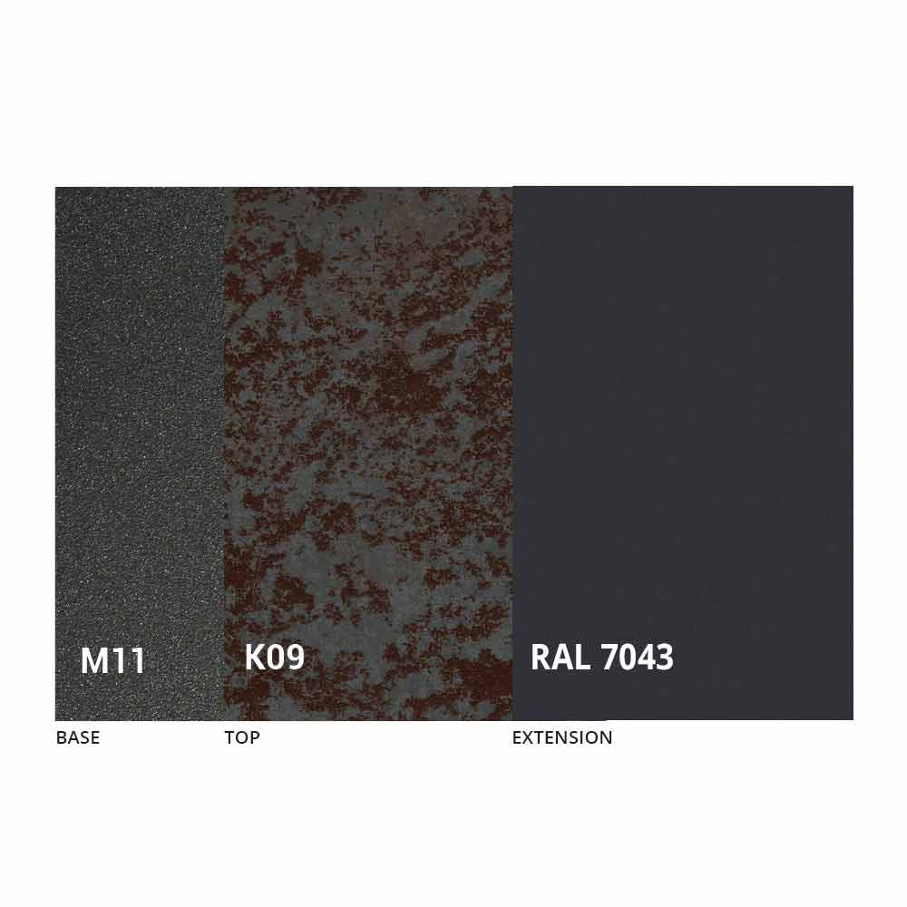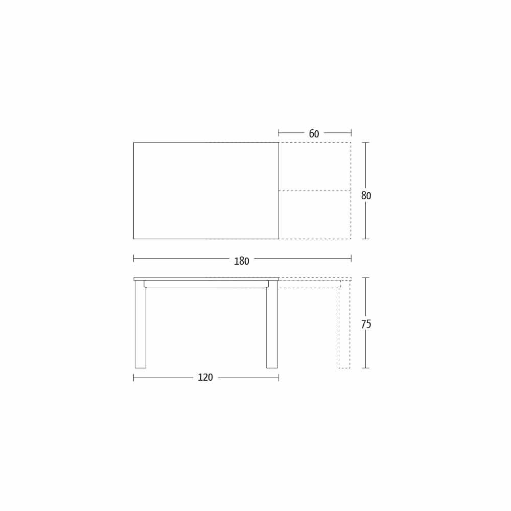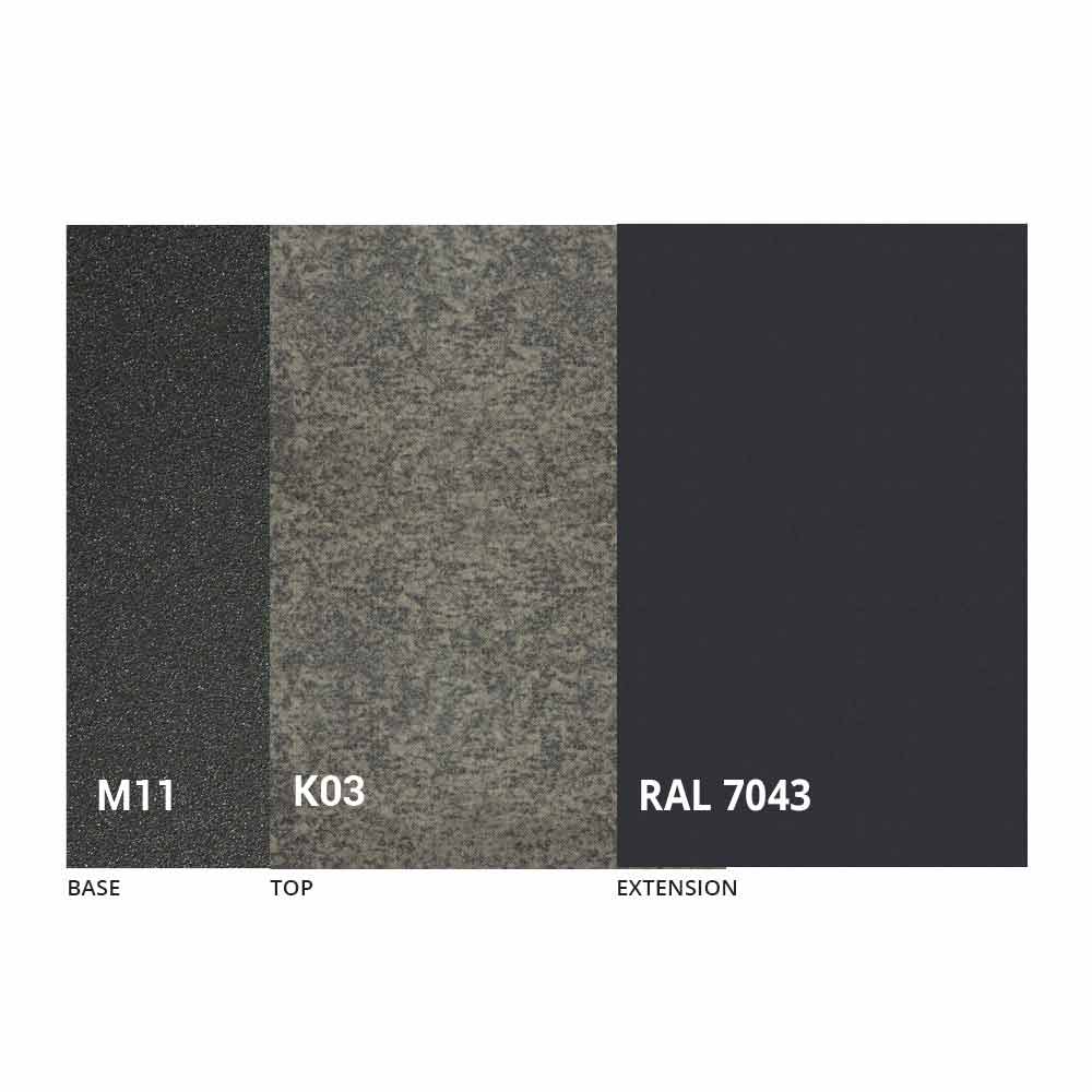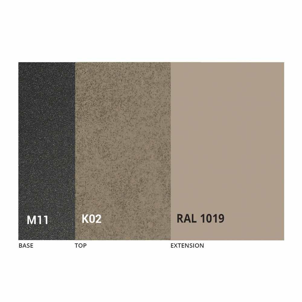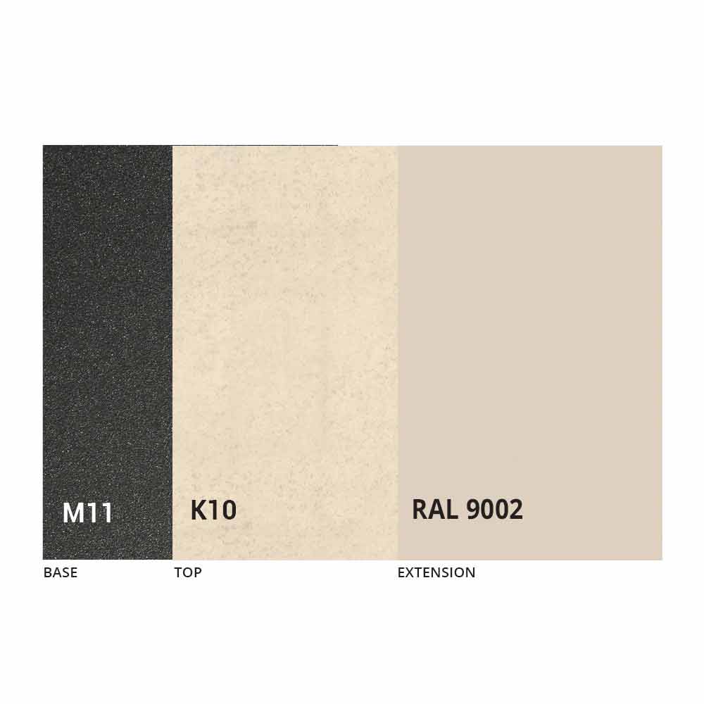 Caracterizado por una tapa de cerámica laminada sobre un panel de melamina y una base de metal pintado en grafito gofrado, la tapa se puede extender gracias a un mecanismo telescópico con una extensión plegable interna en el mismo color que el panel inferior.