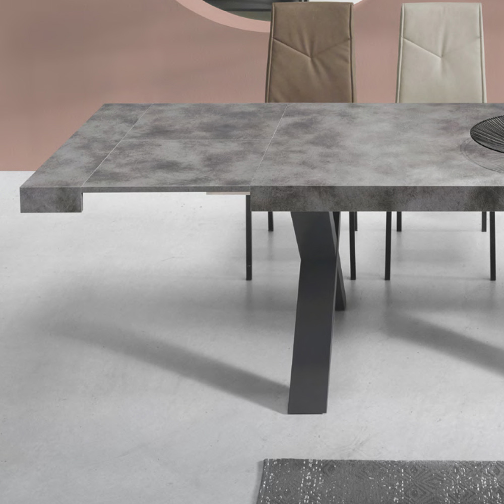 Mesa de comedor con sobre y extensiones en laminado efecto cemento y estructura en acabado antracita. Un mueble íntegramente fabricado en Italia diseñado para satisfacer las exigencias de quien busca calidad , elegancia y funcionalidad en un solo producto. Lo que llama la atención de su estética es la particular forma cruzada de la base que aporta solidez y robustez al producto además de dar un toque de personalidad exclusiva a su diseño final. En cambio, la elegante tapa de efecto cemento le da a la mesa un estilo imponente capaz de conquistar el papel de protagonista dentro de la habitación gracias también a sus grandes dimensiones.