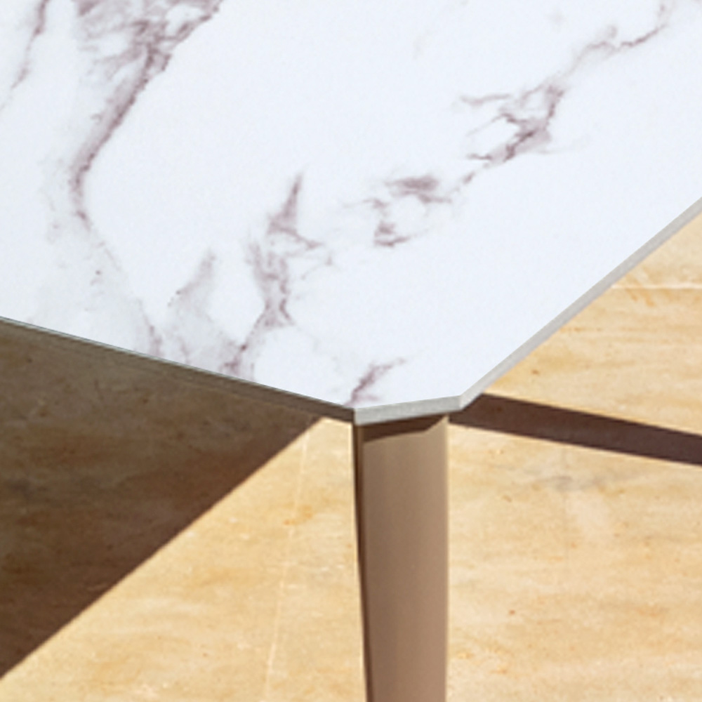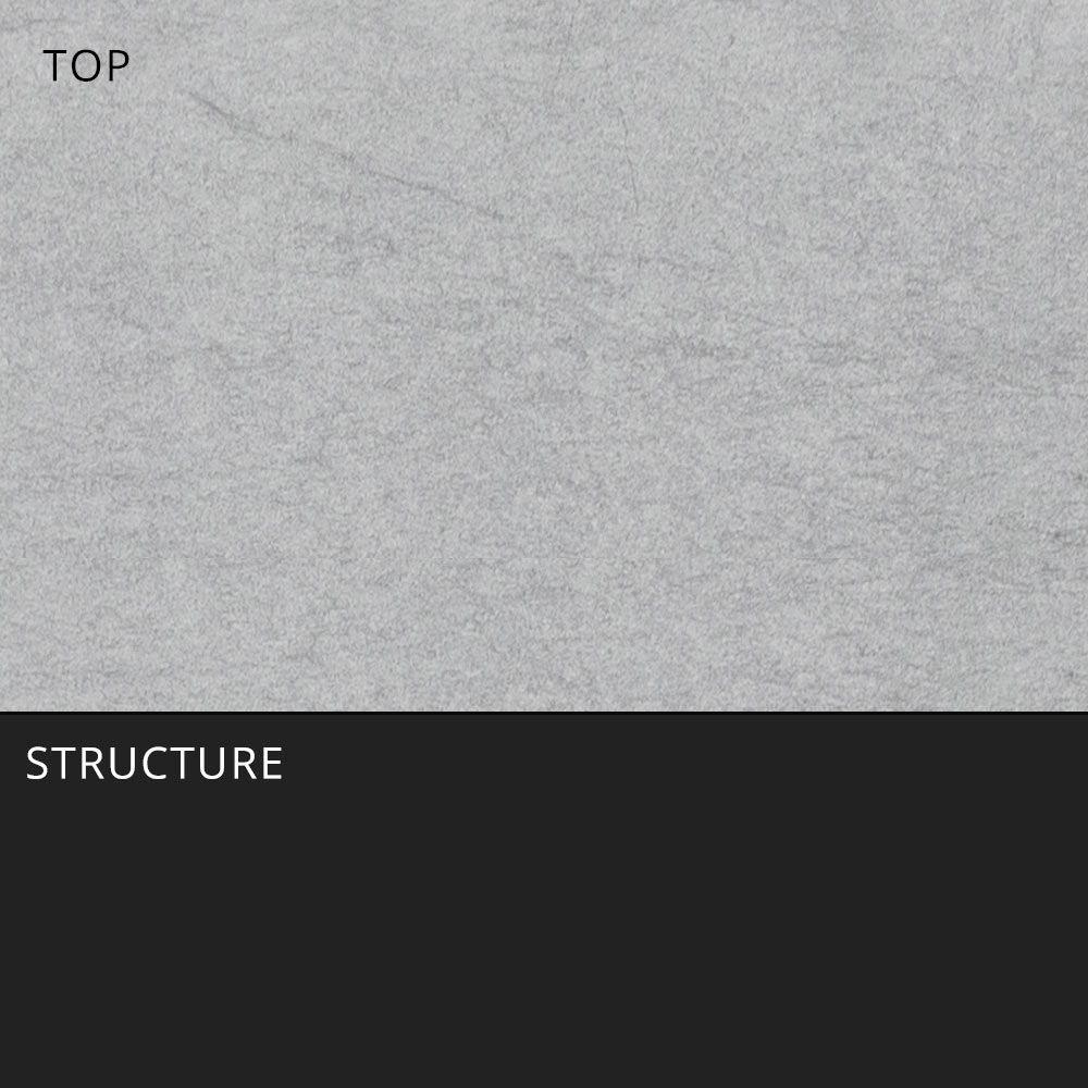 La estructura es de aluminio con recubrimiento de polvo epoxi , combinado con el tablero rectangular en gres de 12 mm de espesor con extensiones incluidas.